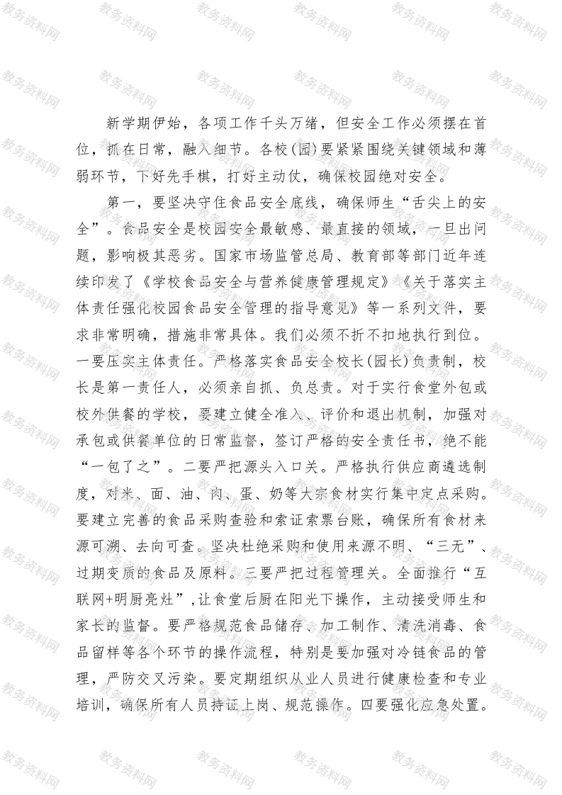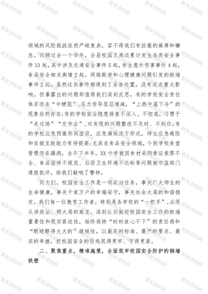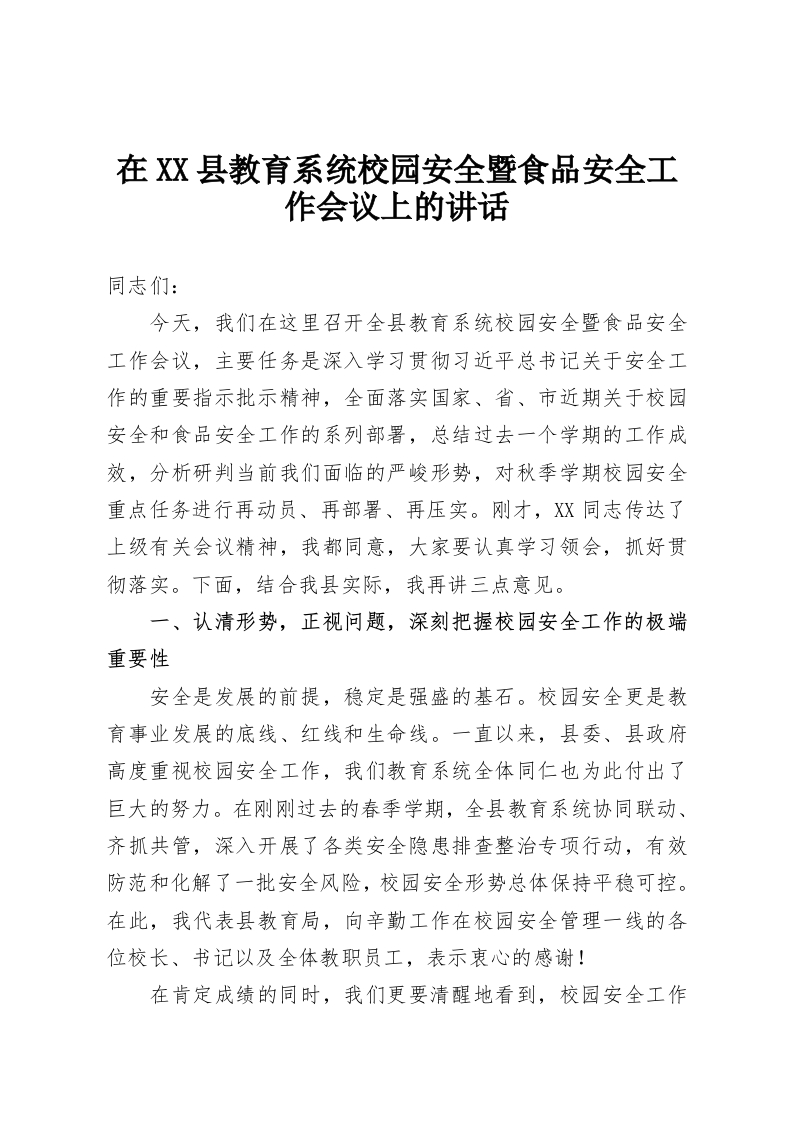 在XX县教育系统校园安全暨食品安全工作会议上的讲话同志们:今天,我们在这里召开全县教育系统校园安全暨食品安全工作会议,主要任务是深入学习贯彻习近平总书记关于安全工作的重要指示批示精神,全面落实国家、省、市近期关于校园安全和食品安全工作的系列部署,总结过去一个学期的工作成效,分析研判当前我们面临的严峻形势,对秋季学期校园安全重点任务进行再动员、再部署、再压实。刚才,XX同志传达了上级有关会议精神,我都同意,大家要认真学习领会,抓好贯彻落实。下面,结合我县实际,我再讲三点意见。一、认清形势,正视问题,深刻把握校园安全工作的极端重要性安全是发展的前提,稳定是强盛的基石。校园安全更是教育事业发展的底线、红线和生命线。一直以来,县委、县政府高度重视校园安全工作,我们教育系统全体同仁也为此付出了巨大的努力。在刚刚过去的春季学期,全县教育系统协同联动、齐抓共管,深入开展了各类安全隐患排查整治专项行动,有效防范和化解了一批安全风险,校园安全形势总体保持平稳可控。在此,我代表县教育局,向辛勤工作在校园安全管理一线的各位校长、书记以及全体教职员工,表示衷心的感谢!在肯定成绩的同时,我们更要清醒地看到,校园安全工作