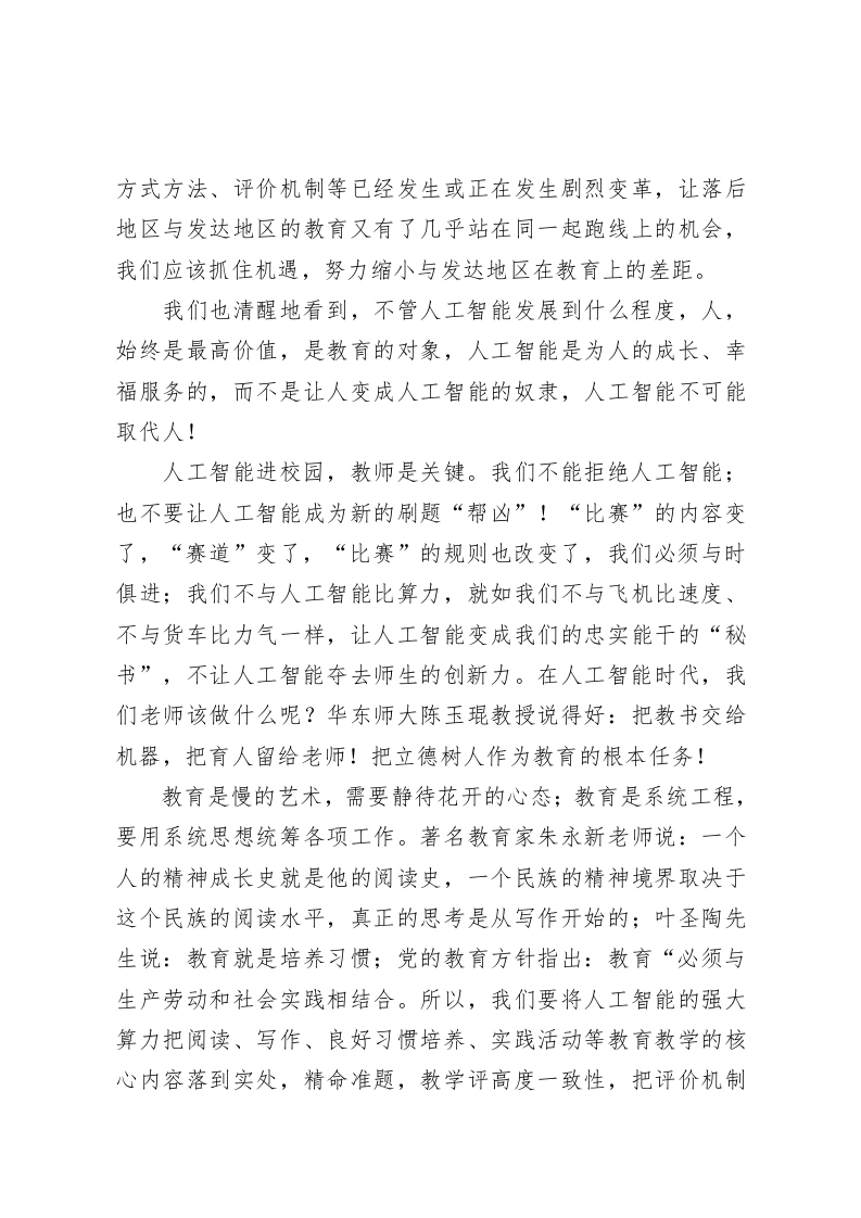 在X县提升教育质量分析会上的发言:积极拥抱人工智能,切实提高教育质量各位领导、各位同仁:大家好!根据会议安排,我把X小学人工智能赋能教育质量提升工作进行简要汇报。近年来,X小学高度重视人工智能赋能教育教学质量提升工作,特别是今年1月中旬Deepseek横空出世后,我们立即规划人工智能与教育深度融合的相关事务。3月份,组建了8个人工智能进校园突击队,对人工智能工具运用进行重点突破:4月份,各突击队全面攻关,探索人工智能在学校教育教学上的运用操作,并于4月30日形成操作手册,印发给每个教师;5月份,全校推广;6月份,查缺补漏,让每个老师掌握基本的教育人工智能工具。从今年3月至9月,我们选派50余名老师先后赴武汉、江苏、重庆、长沙、北京、杭州等地参加教育人工智能学习培训,不走弯路,直奔大师,让老师们充分认识到人工智能的强大力量,从而自觉地把人工智能运用到教育教学工作中。人工智能是人类科技跨越式发展的成果,是人类第四次工业革命的核心驱动力,人工智能赋能教育高质量发展已成为不可阻挡的时代潮流。在国际上,中国与美国引领着人工智能的发展;在国内,在人工智能等方面的影响下,教育教学的内容、