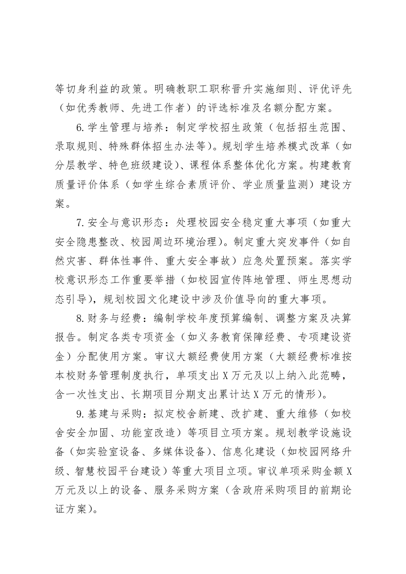 中小学校长办公会议议事制度(2025年试行)第一章总则第一条制度宗旨与依据为深入贯彻党和国家的教育方针政策,依据相关法律法规,紧密结合本校实际办学情况,特制定本校长办公会议制度,旨在构建科学、规范、高效的学校行政议事决策机制,推动学校各项事业稳健发展。第二条学校领导体制学校全面实行党组织领导的校长负责制。校长作为学校法定代表人,在党组织的坚强领导下,依法依规履行教育教学与行政管理双重职责。致力于落实立德树人根本任务,凝聚全体教职工力量,共同推动学校事业迈向科学发展新高度,全力支持党组织充分发挥把握方向、统领大局、科学决策、管理班子、培育队伍、保障落实的核心领导作用。第三条会议定位与职能校长办公会议作为学校行政议事决策的核心机构,承担着多项关键职能。负责研究拟定需提交党组织会议审议决定的重大事项建议方案,深入研究并直接决定学校行政具体事务,全面部署落实党组织的各项决议,是校长履行职责的关键工作形式。第四条工作机制与原则校长办公会议遵循集体研究、民主决策、分工负责、协同