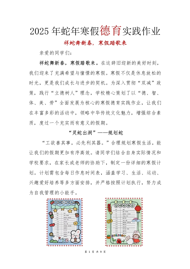 2025年蛇年寒假德育实践作业祥蛇舞新春,寒假踏歌来亲爱的同学们:祥蛇舞新春,寒假踏歌来。在这辞旧迎新的美好时刻,我们迎来了充满希望与憧憬的寒假。寒假不仅是休息放松的时光,更是我们成长与进步的契机。为深入贯彻“双减”政策,践行“立德树人”理念,学校精心策划了以“德、智、体、美、劳”全面发展为核心的寒假德育实践作业,让我们在丰富多彩的活动中,领略中华传统文化魅力,增强综合素质,度过一个充实而有意义的假期。“灵蛇出洞”一一规划蛇“工欲善其事,必先利其器。”合理规划寒假生活,能让我们的假期更加有序高效。请同学们结合自身实际情况和学校要求,在家长或老师的协助下,制定一份详细的寒假计划。计划需包含每日作息时间表,涵盖学习、生活、运动、兴趣爱好培养等多方面安排,并严格按照计划执行,努力成为自我管理的小能手。第1页共9页