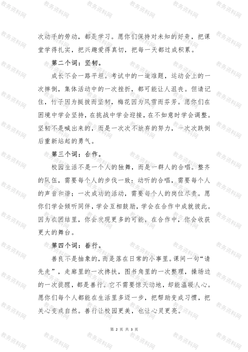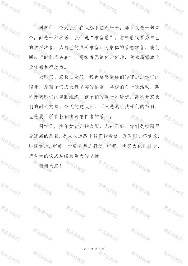 第76个少先队建队日校长讲话稿一强国复兴有我,争当新时代好少年亲爱的同学们、老师们:当晨曦洒落校园,当队旗再次高高飘扬,我们迎来了第76个建队日。红领巾在胸前鲜艳明亮,那是最真切的色彩:整齐的队伍昂首挺立,那是最动人的姿态。今天,我们不仅是在庆祝,更是在提醒自己:少年当有理想,成长当有方向,行动当有力量。七十六年的时光,留下了少年们的脚印,也见证了少先队一步步的发展。那条鲜红的领巾,承载着无数同龄人的热爱与担当。它系在胸前,不是点缀,而是一份鞭策;它飘在风中,不是装饰,而是一声召唤。每一次系紧红领巾,就是一次郑重的约定:我要守纪律、讲礼貌,我要勤学习、乐劳动,我要用实际行动让自己每天更进步。同学们,建队日,是成长的节点。它像一个庄重的号角,提醒我们停下脚步,回望过去,也展望未来。今天,我想和大家谈四个词:学习、坚韧、合作、善行。第一个词:学习。学习不是负担,而是点亮智慧的灯。你们在教室里的每一次举手发言,在图书角里每一次静静翻阅,在操场边每一次认真观察,都是成长的印记。学习不仅仅是书本上的知识,更是生活中的体验。一次小小的尝试、一句礼貌的问候、一第1页共3页