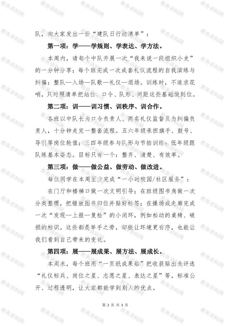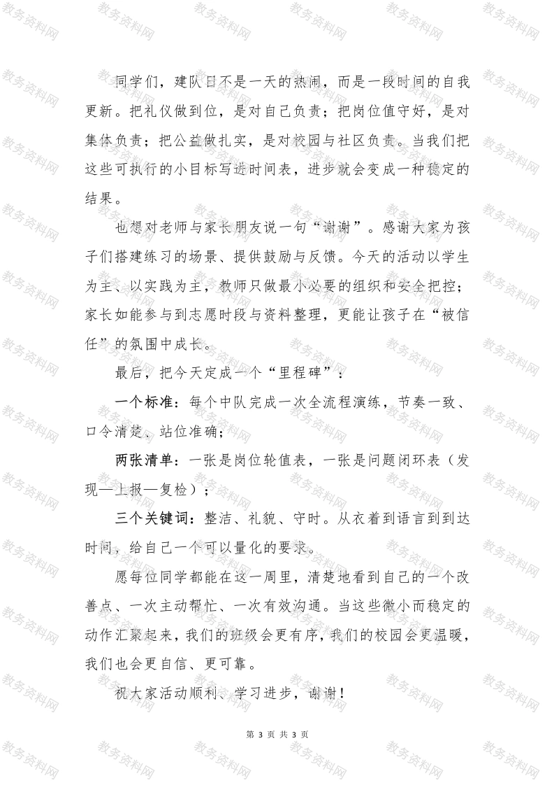 少先队建队日大队辅导员讲话稿—强国复兴有我,争当新时代好少年同学们、老师们、家长朋友们:大家好!今天,我们在校园里举行第76个建队日主题活动。每一年的这个时刻,都是一次面向成长的出发:我们回望少年组织的诞生与发展,也把目光放到每位同学的当下与未来。我们更关心的,是如何把“礼仪、规则、服务、合作、坚持”这些关键词,落到看得见的行动里。先一起做一个“时间回望”。在上世纪中期,一个面向全国少年儿童的统一组织成立,后来更名为今天大家熟悉的名称。它之所以能走到现在,靠的是一条清晰的主线:团结、进步、服务同伴、建设校园与社区。这条主线跟我们每一天的学习生活息息相关一一整理好衣冠、做事守时守序、关照身边的人、在公共环境里多迈一步,都是最具体的传承。再看“标志与礼仪”。队旗、队徽、队礼、队歌,构成了大家共同的识别体系。它们提醒我们:礼仪不是形式,是把尊重与自律变成动作的过程。例如升旗入场要整齐、队列要保持节奏,呼号要清晰,宣誓姿势要标准。只要把这些细节做好,气质就会在日复一日的练习中慢慢长出来。建队日的重要性,在于它把“我是谁、我想成为什么样的人、我今天能做什么”三个问题连在了一起。答案不需要口号,关键是一件件能落地的小事。为此,我代表学校少先第1页共3页