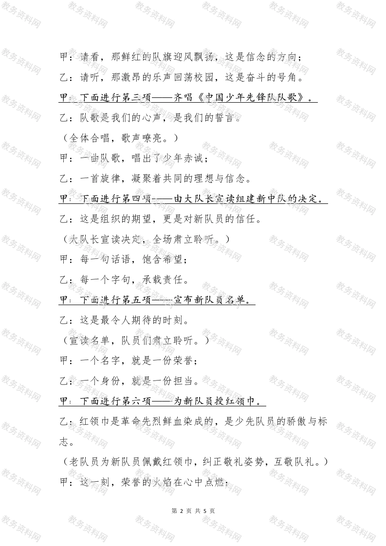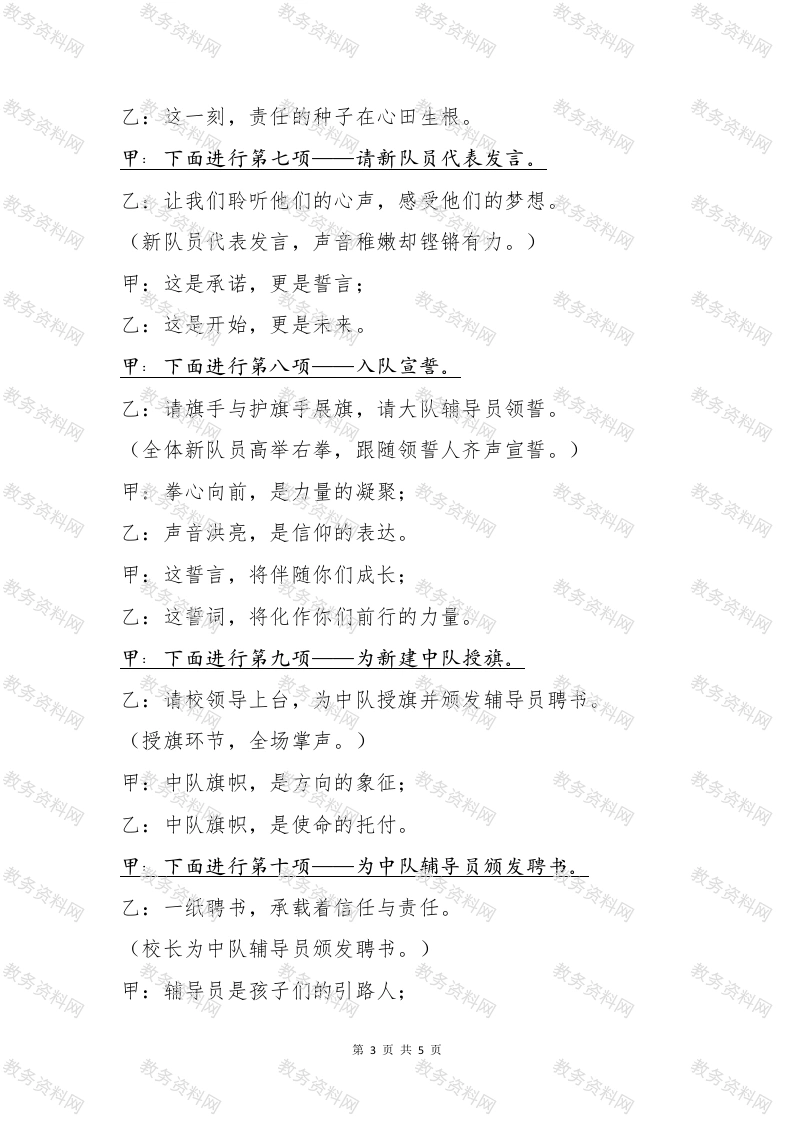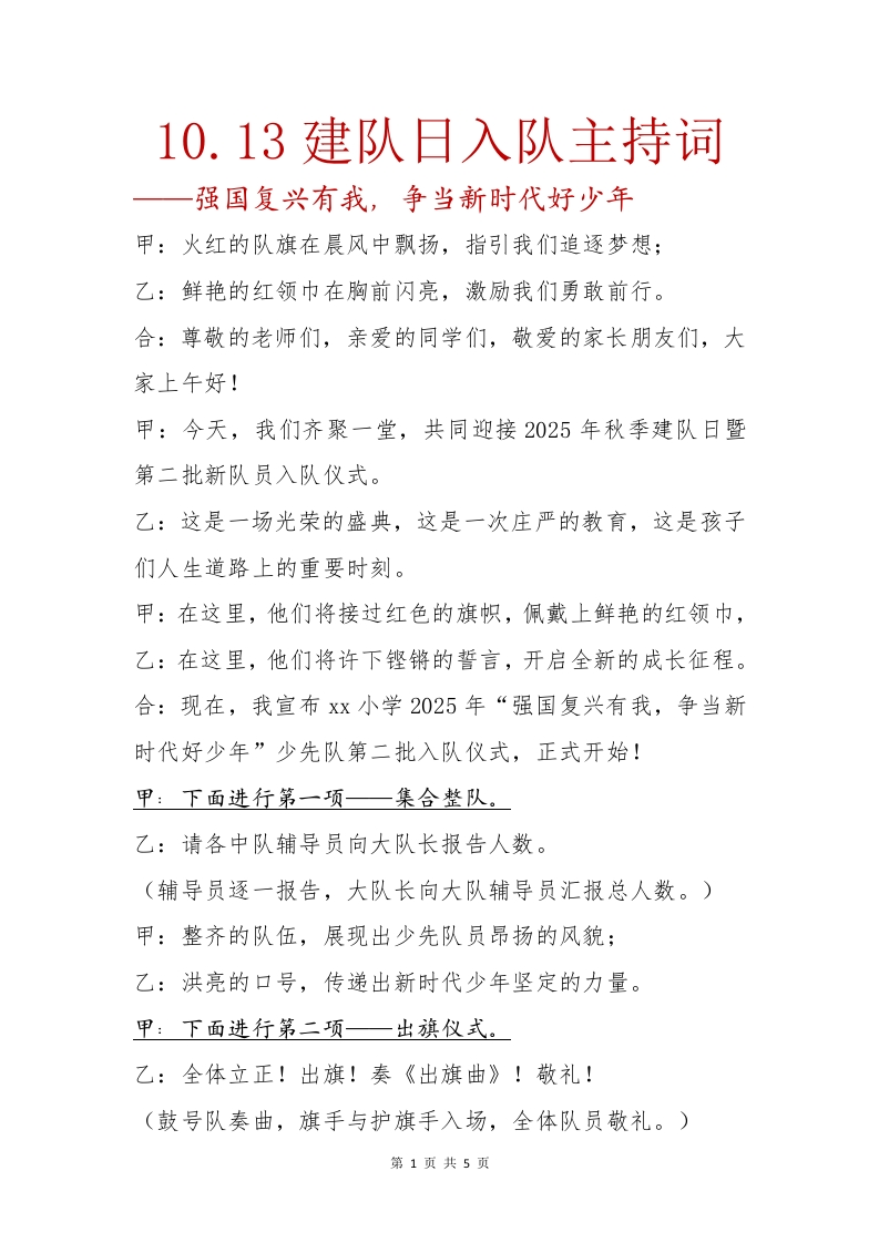 10.13建队日入队主持词一强国复兴有我,争当新时代好少年甲:火红的队旗在晨风中飘扬,指引我们追逐梦想;乙:鲜艳的红领巾在胸前闪亮,激励我们勇敢前行。合:尊敬的老师们,亲爱的同学们,敬爱的家长朋友们,大家上午好!甲:今天,我们齐聚一堂,共同迎接2025年秋季建队日暨第二批新队员入队仪式。乙:这是一场光荣的盛典,这是一次庄严的教育,这是孩子们人生道路上的重要时刻。甲:在这里,他们将接过红色的旗帜,佩戴上鲜艳的红领巾,乙:在这里,他们将许下铿锵的誓言,开启全新的成长征程。合:现在,我宣布xx小学2025年“强国复兴有我,争当新时代好少年”少先队第二批入队仪式,正式开始!甲:下面进行第一项一集合整队。乙:请各中队辅导员向大队长报告人数。(辅导员逐一报告,大队长向大队辅导员汇报总人数。)甲:整齐的队伍,展现出少先队员昂扬的风貌;乙:洪亮的口号,传递出新时代少年坚定的力量。甲:下面进行第二项—出旗仪式。乙:全体立正!出旗!奏《出旗曲》!敬礼!(鼓号队奏曲,旗手与护旗手入场,全体队员敬礼。)第1页共5页