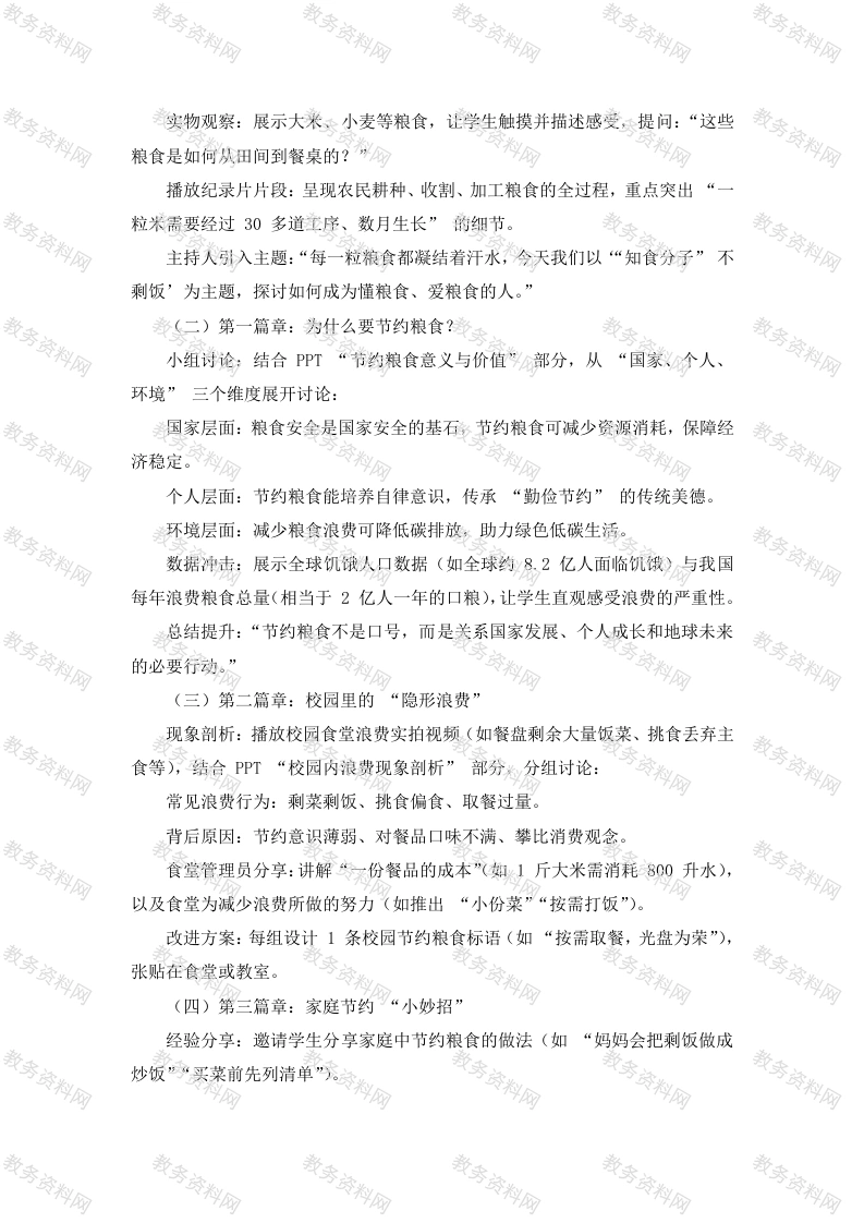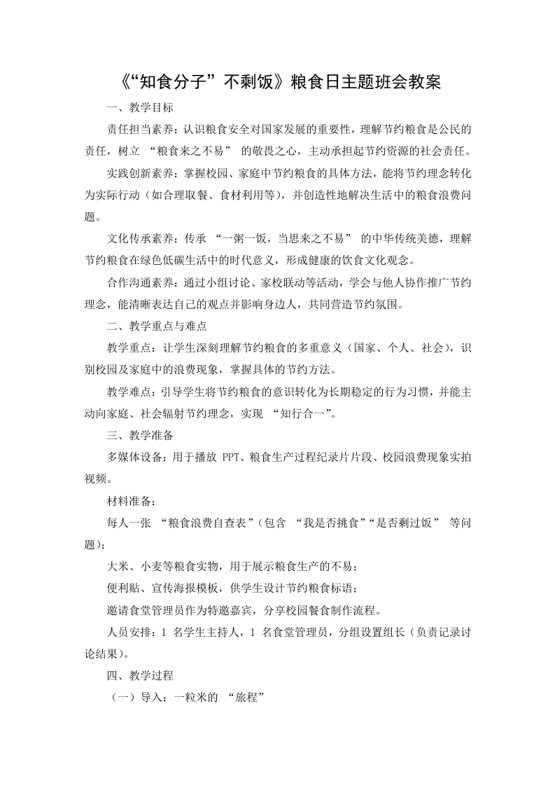 《“知食分子”不剩饭》粮食日主题班会教案一、教学目标责任担当素养:认识粮食安全对国家发展的重要性,理解节约粮食是公民的责任,树立“粮食来之不易”的敬畏之心,主动承担起节约资源的社会责任。实践创新素养:掌握校园、家庭中节约粮食的具体方法,能将节约理念转化为实际行动(如合理取餐、食材利用等),并创造性地解决生活中的粮食浪费问题。文化传承素养:传承“一粥一饭,当思来之不易”的中华传统美德,理解节约粮食在绿色低碳生活中的时代意义,形成健康的饮食文化观念。合作沟通素养:通过小组讨论、家校联动等活动,学会与他人协作推广节约理念,能清晰表达自己的观点并影响身边人,共同营造节约氛围。二、教学重点与难点教学重点:让学生深刻理解节约粮食的多重意义(国家、个人、社会),识别校园及家庭中的浪费现象,掌握具体的节约方法。教学难点:引导学生将节约粮食的意识转化为长期稳定的行为习惯,并能主动向家庭、社会辐射节约理念,实现“知行合一”。三、教学准备多煤体设备:用于播放PPT、粮食生产过程纪录片片段、校园浪费现象实拍视频。材料准备:每人一张“粮食浪费自查表”(包含“我是否挑食”“是否剩过饭”等问题)大米、小麦等粮食实物,用于展示粮食生产的不易:便利贴、宣传海报模板,供学生设计节约粮食标语:邀请食堂管理员作为特邀嘉宾,分享校园餐食制作流程。人员安排:1名学生主持人,1名食堂管理员,分组设置组长(负责记录讨论结果)。四、教学过程(一)导入:一粒米的“旅程”