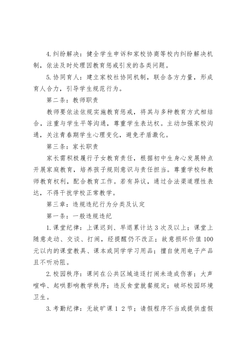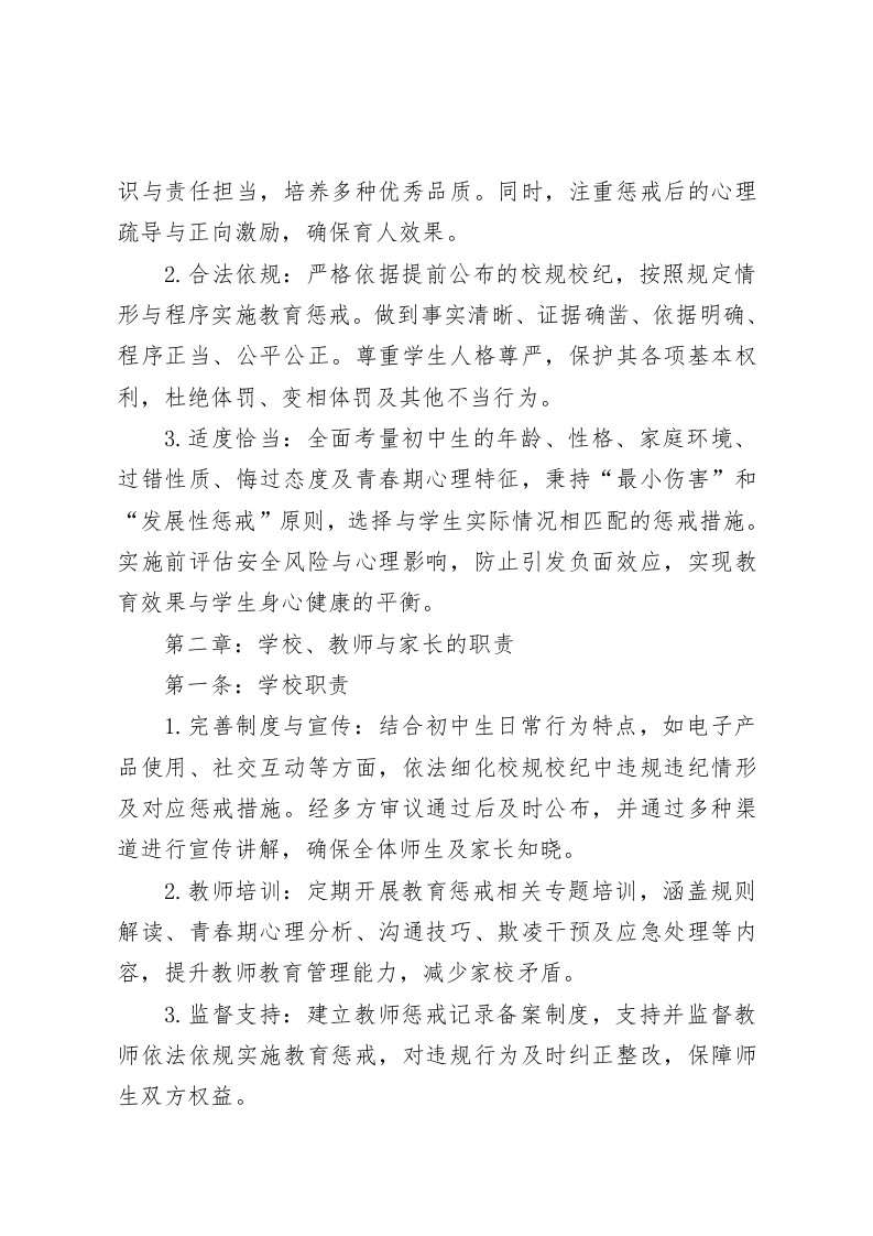 初中校规校纪及教育惩戒实施细则(2025年9月修订版)开篇引言在初中教育阶段,塑造学生良好品德、保障其身心健康发展,是我们共同的目标。为达成这一目标,建立一套科学、合理且人性化的校规校纪与教育惩戒体系至关重要。这不仅能规范学生行为,更能引导他们在成长道路上树立正确的价值观和行为准则。第一章:核心理念与原则第一条:理念基石初中教育以立德树人为根本任务,学校与教师肩负着教育教学和管理的重任,要在维护学生合法权益的基础上,助力学生成长为有理想、有道德、有文化、有纪律的新时代青年。第二条:教育惩戒本质教育惩戒并非简单的惩罚,而是基于教育目的,针对违规违纪学生开展的管理、训导及矫治活动。它应与赏识、挫折、责任担当等教育方式有机融合,着重培养学生的规则意识、法治观念与道德修养,避免单纯惩戒,充分尊重初中生青春期的自尊心和自主发展需求。第三条:实施原则1.育人为先:以关爱学生为出发点,遵循初中教育规律和学生认知发展特点。通过惩戒引导学生剖析错误,强化规则意