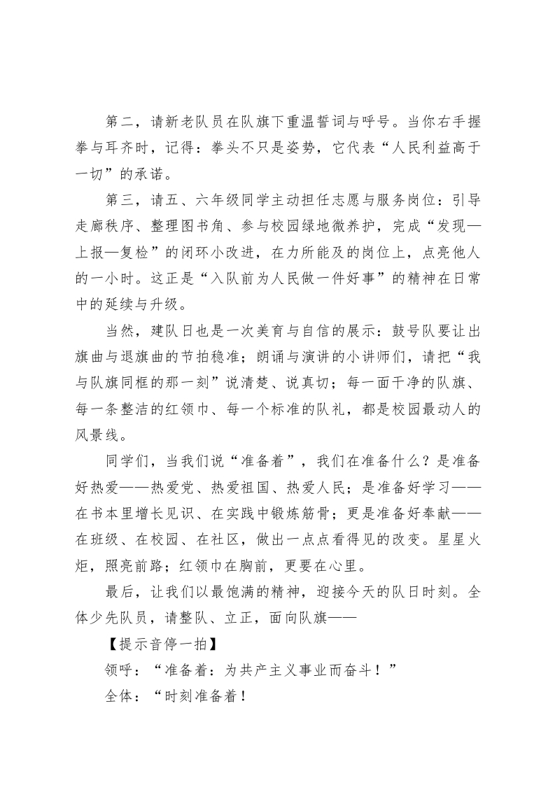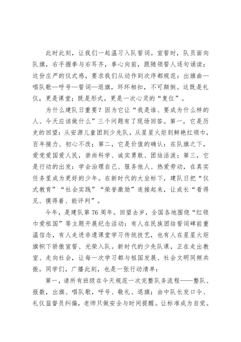 第76个少先队建队日广播稿一强国复兴有我,争当新时代好少年亲爱的老师们、同学们,早上好!这里是校园之声。今天,我们在熟悉的晨风里,迎来了第76个中国少年先锋队建队日。时间回到1949年10月13日,新中国成立伊始,全国统一的少年儿童组织在这一天宣告成立一一它的名字,叫“中国少年儿童队”;四年之后,“先锋”的旗帜高高举起,组织更名为“中国少年先锋队”。此后,每年的10月13日,成为红领巾共同的节日。同学们,什么是“先锋”?在党的历史词典里,它意味着“走在前面的人”一一为人民的利益开路的人。红领巾为什么红?因为它来自于红旗的一角,象征着革命的胜利与先辈的牺牲;队旗上五角星与火炬并举,寓意中国共产党的领导和照亮前路的真理之光。每一次出旗、退旗,每一个标准的队礼,都是一次立场与信念的再确认。中国少年先锋队是中国共产党领导、由共青团受党委托直接领导的群众性儿童组织。它面向6一14岁的少年儿童开展组织教育、自主教育和实践教育,把价值引领、能力成长与社会责任紧紧编织在一起。今天的少先队规模宏大、体系完备,口号铿锵一一“准备着:为共产主义事业而奋斗!”“时刻准备着!”这不仅是一句口号,更是一代又一代少年主动担当的宣言。
