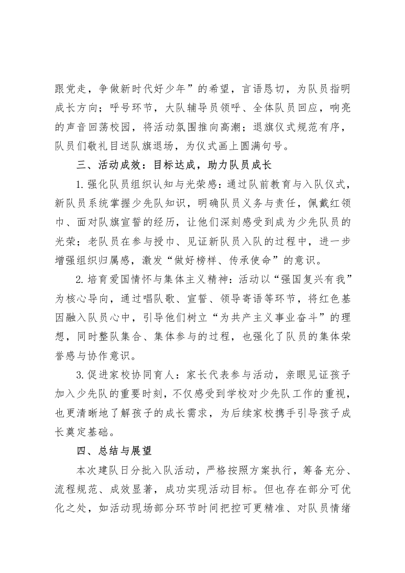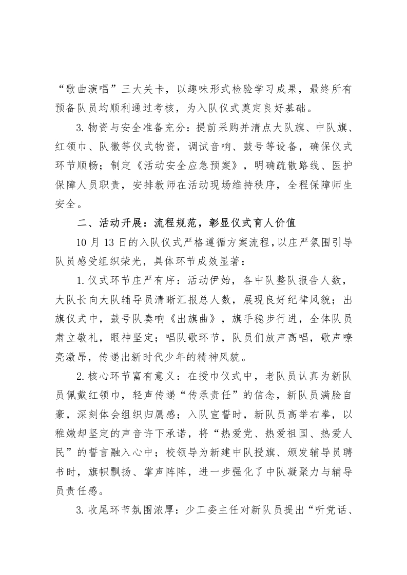 强国复兴有我,争当新时代好少年”2025年“10.13建队日”分批入队活动总结2025年10月13日,是中国少年先锋队建队76周年纪念日。为深入贯彻新时代少先队工作要求,传承少先队光荣传统,强化队员组织归属感与使命感,我校以“强国复兴有我,争当新时代好少年”为主题,在学校大礼堂成功举办分批入队活动。全体少先队员、新入队队员、家长代表及学校领导、教师共同参与,活动流程规范、氛围庄严,达到预期目标,现将具体情况总结如下:一、活动筹备:精心部署,筑牢活动基础为确保活动顺利开展,学校提前规划、细致筹备,从组织架构到物资准备形成完整保障体系。1.组织保障到位:成立以校领导为组长,少先队大队辅导员、各年级班主任为成员的活动领导小组,明确分工职责一一组长统筹整体活动,辅导员负责流程设计与队员培训,班主任协调学生组织与家长沟通,形成“上下联动、各司其职”的工作格局,避免环节疏漏。2.队前教育扎实:自9月起至10月上旬,聚焦“六知六会一做”核心内容开展系列队前教育。通过专题班会讲解少先队历史、队旗队徽含义,利用课间操时间示范红领巾佩戴、队礼规范动作,组织音乐课教唱《中国少年先锋队队歌》;同时创新开展“入队知识闯关”活动,设置“知识问答”“礼仪实操”