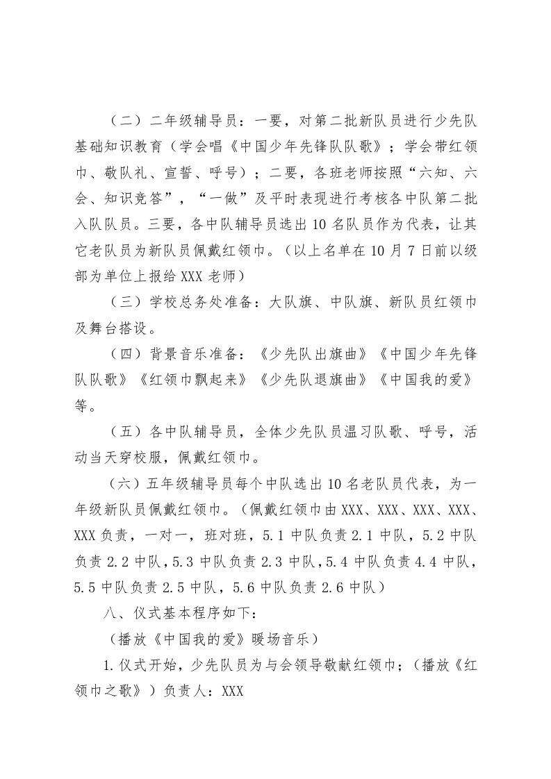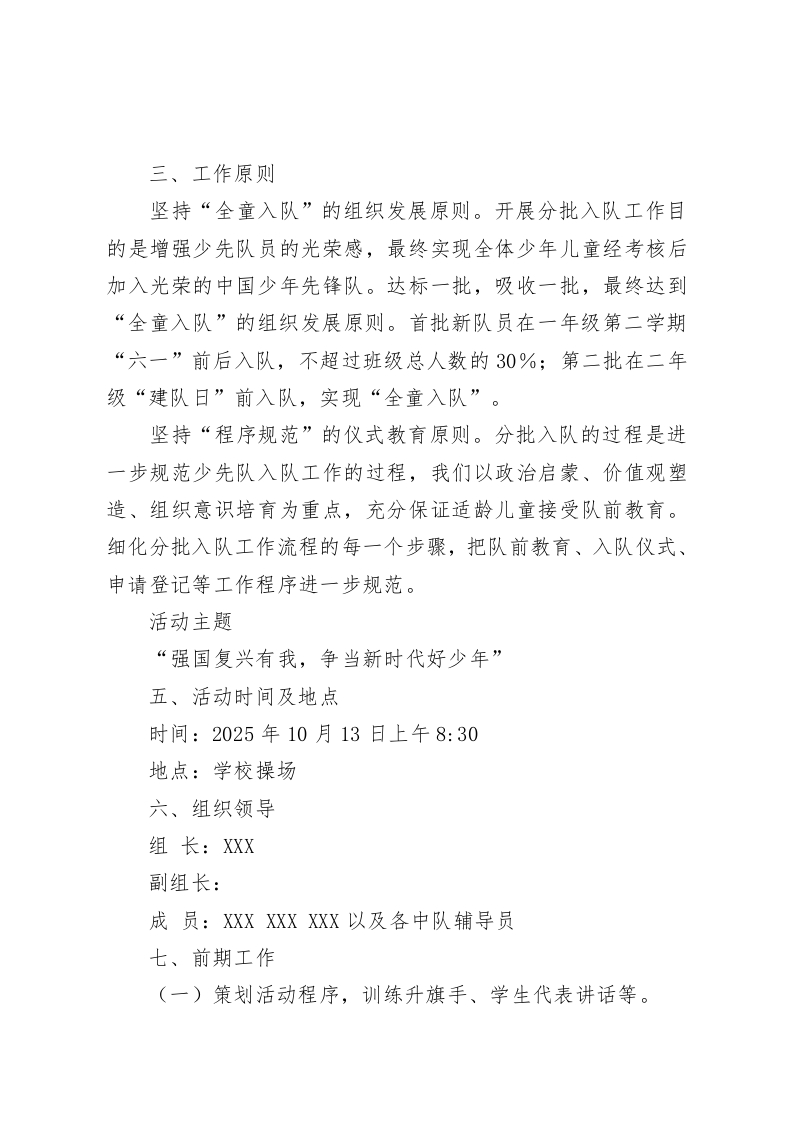 强国复兴有我,争当新时代好少年”2025年“10.13建队日”分批入队实施方案星星火炬照征程,少先队员共筑梦。为切实增强少先队员光荣感,实施全童分批入队。根据共青团中央、教育部、全国少工委指定的《关于构建阶梯式成长激励体系增强少先队员光荣感的指导意见》精神,结合我校。实际情况,现制定学校2025年“10.13建队日”少先队新队员第二批入队仪式、新建中队建队仪式活动方案。一、指导思想少先队是D创立和领导并委托共青团直接领导的中国少年儿童群团组织,是少年儿童学习中国特色社会主义和共产主义的学校,是建设社会主义和共产主义的预备队。深入落实XJP总书记关于少年儿童和少先队工作的重要指示精神,切实增强少先队员的光荣感和组织归属感。二、活动目的以实践体验活动为基本途径,通过充分的队前教育、按照具体的入队标准、规范的入队程序和庄严的入队仪式,有组织、分批次吸收适龄少年儿童加入少先队,通过积极主动地参与活动,帮助他们为自己能加入少先队确定成长小目标,在生动活泼、丰富多彩的争章活动中,将这些基本知识刻在心中,演化为品质与修养,成为一名合格的少先队员。