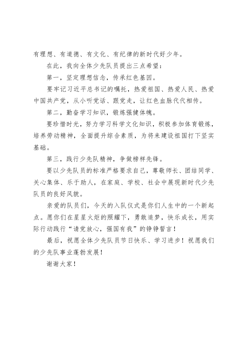 强国复兴有我,争当新时代好少年”2025年建队日分批入队仪式少工委主任讲话稿尊敬的各位领导、老师们、亲爱的少先队员同学们、家长朋友们:大家好!今天,我们怀着无比激动和自豪的心情,齐聚在这里,共同庆祝中国少年先锋队建队76周年,隆重举行“强国复兴有我,争当新时代好少年”分批入队仪式。在这个庄严而光荣的时刻,我代表学校少工委,向今天光荣加入少先队的新队员们表示最热烈的祝贺!向为少先队事业辛勤付出的辅导员老师们、关心支持少先队工作的家长朋友们表示最诚挚的感谢!76年来,中国少年先锋队在党的领导下,始终高举星星火炬旗帜,一代又一代少先队员在组织的培养下茁壮成长,成为祖国建设的栋梁之材。今天,又有一批同学戴上了鲜艳的红领巾,成为少先队组织的新生力量。红领巾是国旗的一角,是无数革命先烈用鲜血染成的象征,它代表着光荣,更代表着责任。同学们,你们生长在一个伟大的时代,国家正走在强国复兴的新征程上。实现中华民族伟大复兴的中国梦,需要一代又一代人的接续奋斗。今天的你们,就是明天的建设者和接班人。“强国复兴有我”,不仅是一句响亮的口号,更是一份沉甸甸的使命。希望你们从小立志向、修品行、练本领,努力成长为