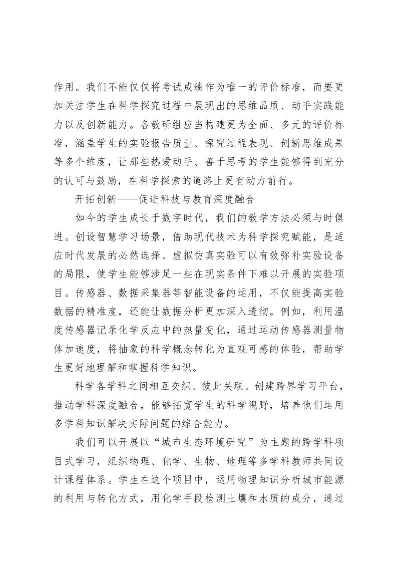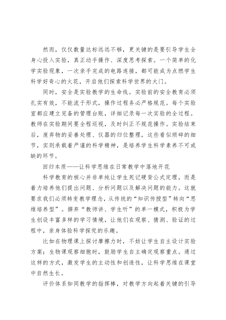 全校科学教育推进会校长讲话稿:用好奇心敲开科学的大门各位老师、同仁们:今天这场会议意义重大且十分及时,刚刚几位分管领导与教研组长的发言,干货满满,分享了许多切实可行的方法与独到深刻的思路,让人深受启发。从大家的交流中,我真切感受到学校在科学教育领域正发生着积极而深刻的变化,更看到了各位老师对科学教育改革所饱含的热情与冲劲,这是我们推进科学教育工作最宝贵的力量。在当下,国家对科学教育重视程度之高,达到了前所未有的高度。今年以来,全面提升中小学科学教育质量被摆在了突出位置,这绝非简单的口号,而是关乎国家创新人才培养、关乎民族未来发展的核心大事。在此宏观背景下,我们召开此次推进会,目的就是要进一步凝聚共识、校准方向,将科学教育工作落地、落实、落细。接下来,围绕“守正创新,推动科学教育迈向高质量发展”这一主题,我从四个方面谈谈想法与期望。筑牢根基一一让实验成为科学探索的源头活水实验是科学教育的基石,课堂则是实验教学的主阵地。实验室不应沦为闲置的空间,实验更不能仅是书本上的理论演绎。对于物理、化学、生物、地理等学科的基础实验,我们务必保证百分百的开出率,这是不可动摇的底线。