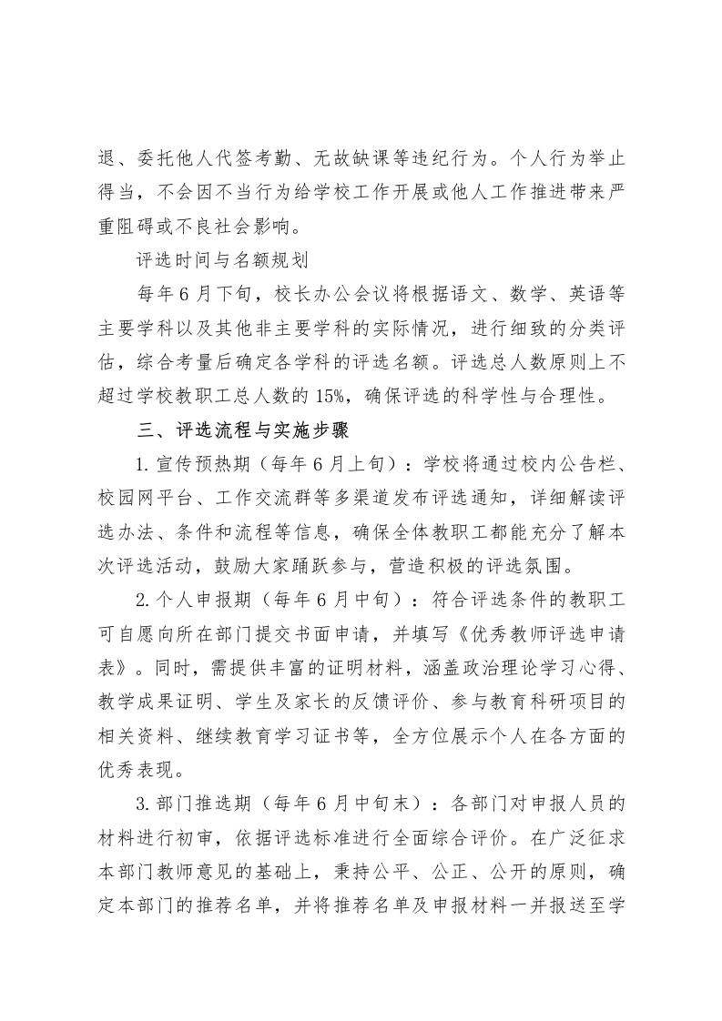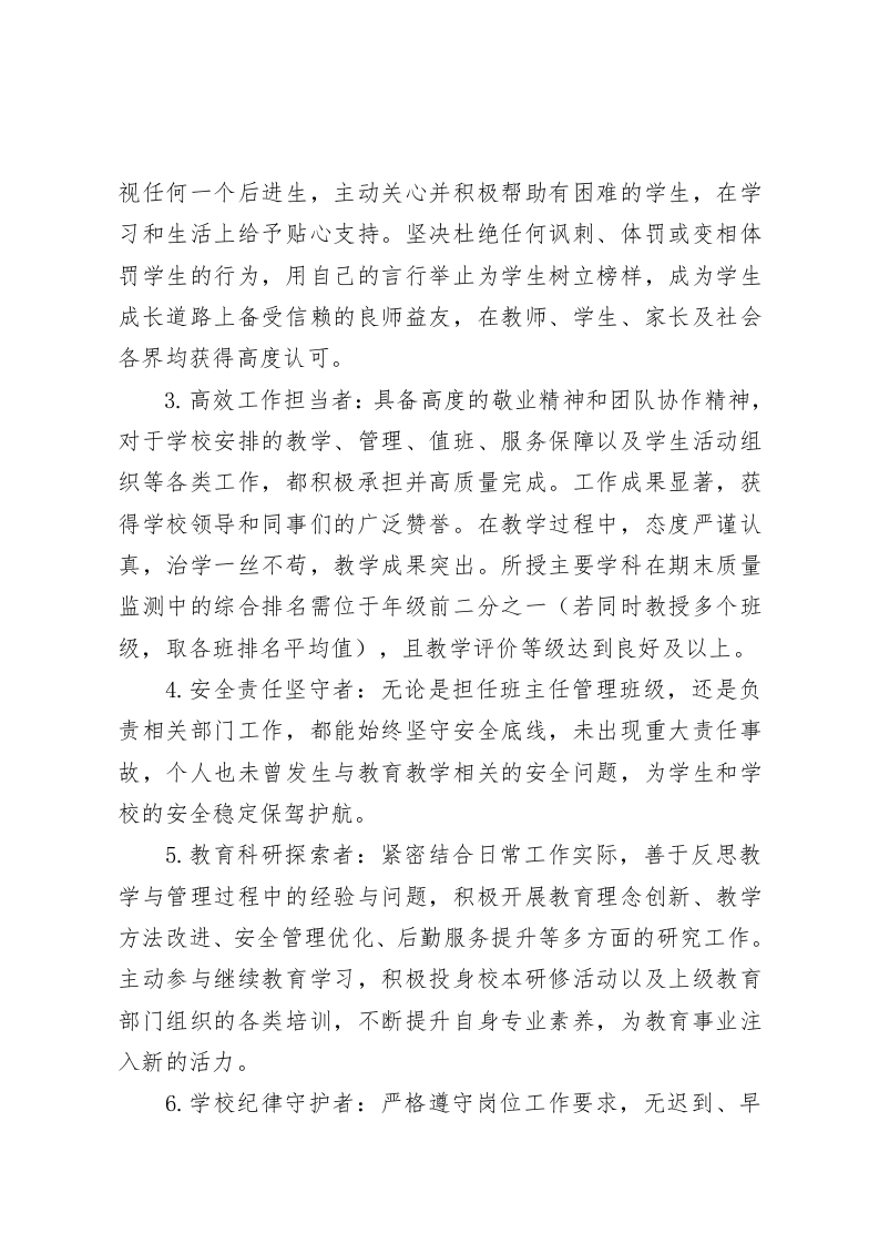 学校“优秀教育工作者(教师)”评比办法在教育改革与发展的浪潮中,为充分激发广大教师投身教学、钻研专业的热情与潜能,营造有利于优秀教师脱颖而出的良好环境,促进教风与校风的良性互动,助力学校打造一支既符合新时代教育需求,又兼具高尚品德与卓越才能的优质师资队伍,切实推动教学质量与教学管理水平稳步提升,经校长办公会议深入研讨、周密论证,并经学校党政联席会议审慎审议通过,特制定本“优秀教师”评选办法。一、评选范围本次评选面向学校全体在职教职工,代课教师也在评选范围内,确保每一位为学校教育事业付出的教职工都有机会参与评选。二、评选核心标准1.教育事业忠诚者:对教育事业怀有坚定不移的热爱,将职业使命铭记于心,以高度的责任心积极参与学校组织的各类政治理论学习,展现对教育事业的坚定信念。在教学岗位上,严格遵循教师职业道德规范,以高尚的品德风范成为学生和同事的楷模,关心集体发展,始终保持谦逊、严谨的态度,自觉遵守法律法规,以端正的作风和良好的品行赢得尊重。2.全面育人践行者:聚焦学生的全方位成长,将品德教育巧妙融入日常教学的每一个环节。平等对待每一位学生,不歧
