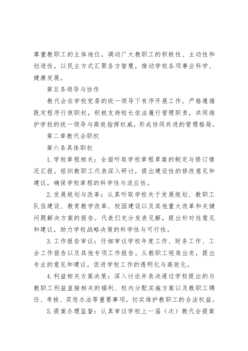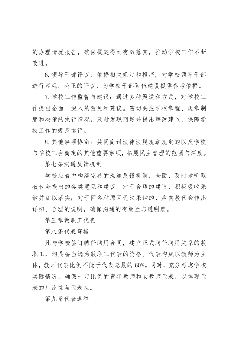 学校教职工代表大会实施细则(2025年修订)第一章总则第一条目的与依据为切实推进学校民主管理进程,充分保障教职工在学校决策、管理与监督环节的参与权利,确保学校管理的科学性、民主性与规范性,依据《中华人民共和国宪法》《中华人民共和国教育法》《中华人民共和国教师法》《中华人民共和国工会法》以及教育部《学校教职工代表大会规定》等相关法律法规,结合本校实际情况,特制定本实施细则。第二条教代会的定位教职工代表大会(以下简称教代会)作为教职工依法参与学校民主管理与监督的核心平台,是学校管理体系不可或缺的重要组成部分。在学校的整体运作中,教代会是教职工行使民主权利、维护自身合法权益的关键组织形式,也是推动学校决策走向科学化、民主化、规范化的重要路径。第三条教代会的导向教代会应始终坚持正确的办学方向,紧密围绕学校的发展战略与教育目标,积极发挥民主管理与监督作用,为学校的长远发展与教育质量提升提供有力支持。第四条教代会的原则教代会秉持民主集中、公平公正、求真务实等原则。充分