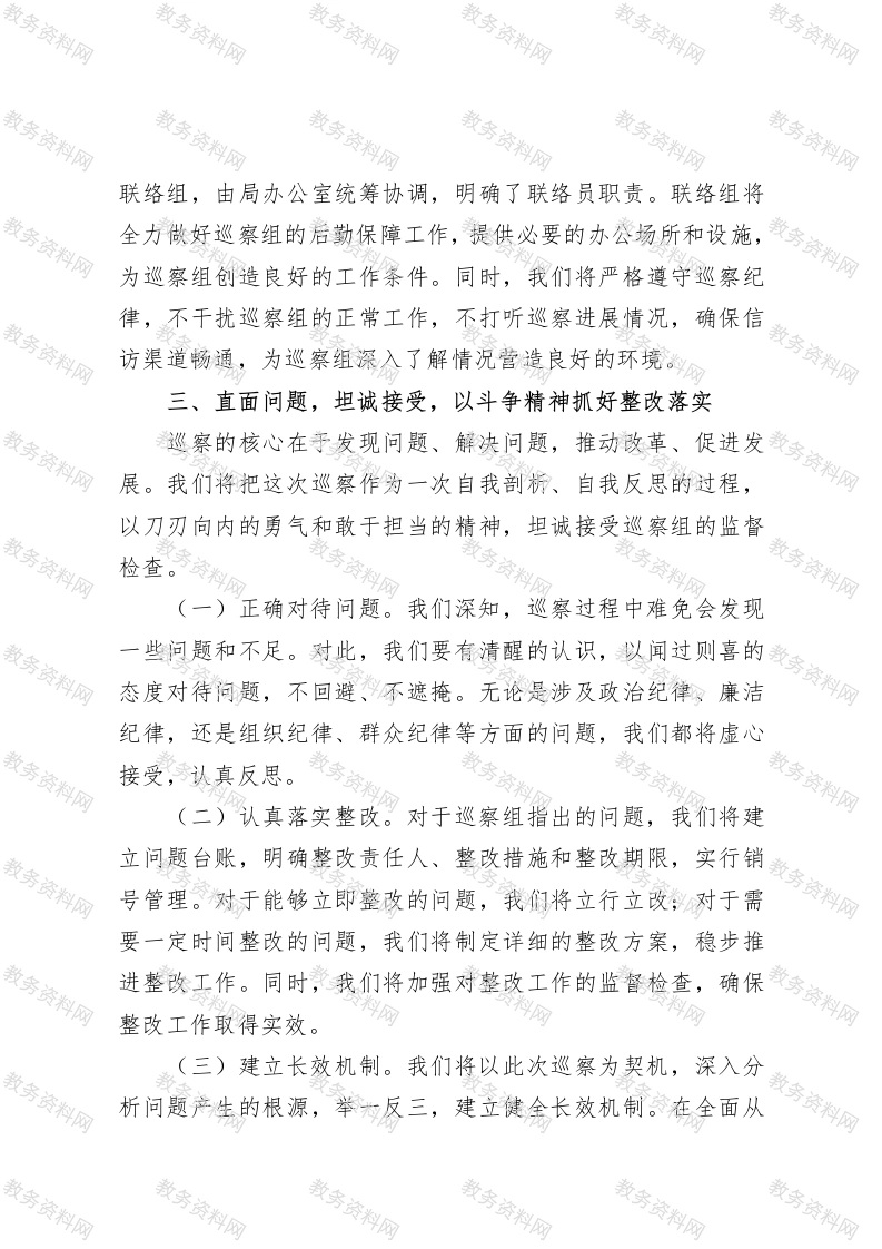 在2025年区委巡察区教育局党委工作动员会上的表态发言尊敬的巡察组各位领导、同志们:区委决定对区教育局党委开展巡察,这是对我们工作的一次全面检阅,也是对我们党性修养和工作作风的一次深度考验。在此,我谨代表区教育局党委,向巡察组的各位领导表示热烈的欢迎和诚挚的感谢!下面,我就配合做好巡察工作,作如下表态:一、提升站位,深化认知,以政治自觉迎接巡察大考教育,乃国之根本、党之大业,肩负着为党育人、为国育才的光荣使命。在当前全区教育事业正处于转型升级、跨越发展的关键阶段,巡察组的进驻,恰似一盏明灯,为我们照亮前行的道路;又如一把标尺,为我们衡量工作的成效。这对于我们精准发现问题、及时纠正偏差,全面贯彻落实中央和省、市、区委关于教育工作的决策部署,具有重大而深远的意义。我们必须站在讲政治、顾大局、强党性的高度,将思想和行动迅速统一到区委的决策部署上来,统一到巡察组的工作要求上来。要深刻认识到,接受巡察监督是我们必须履行的政治责任,是检验我们对党忠诚、对人民负责的重要标尺。我们绝不能将巡察视为走过场、走形式,更不能有“事不关己、高高挂起”的错误思想。我们要把这次巡察当作一次难得的自我提升机遇,通过巡