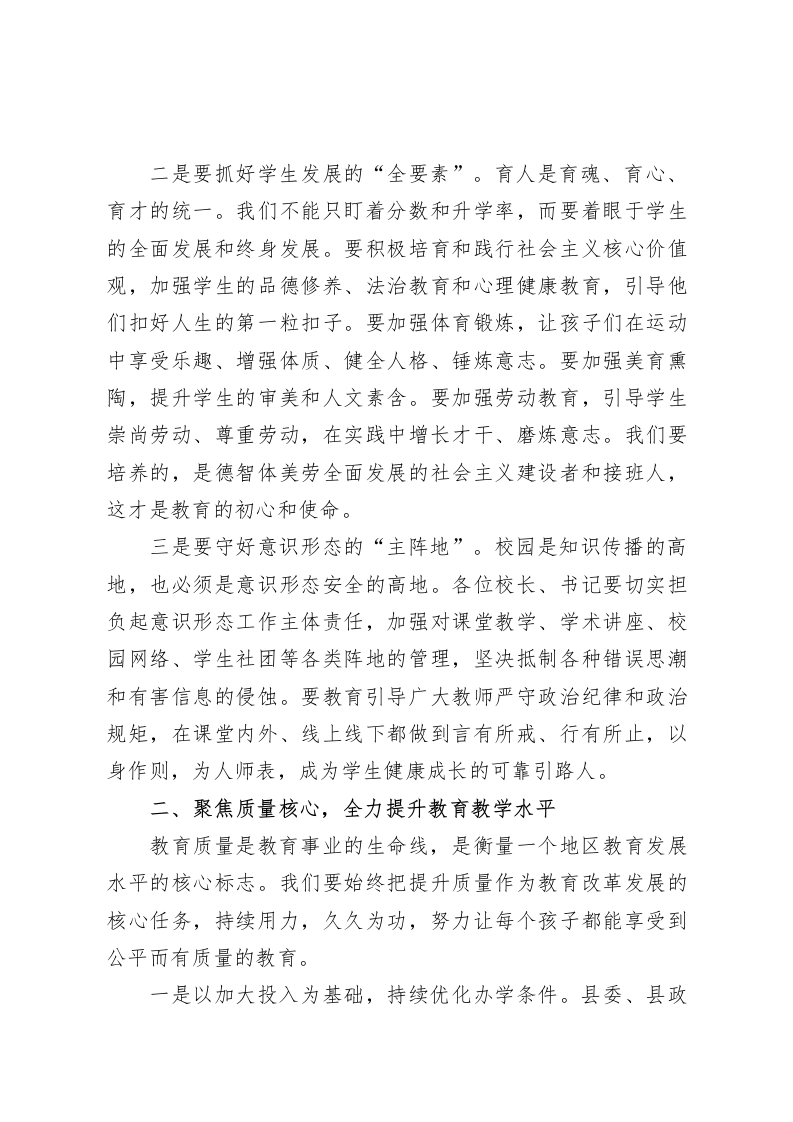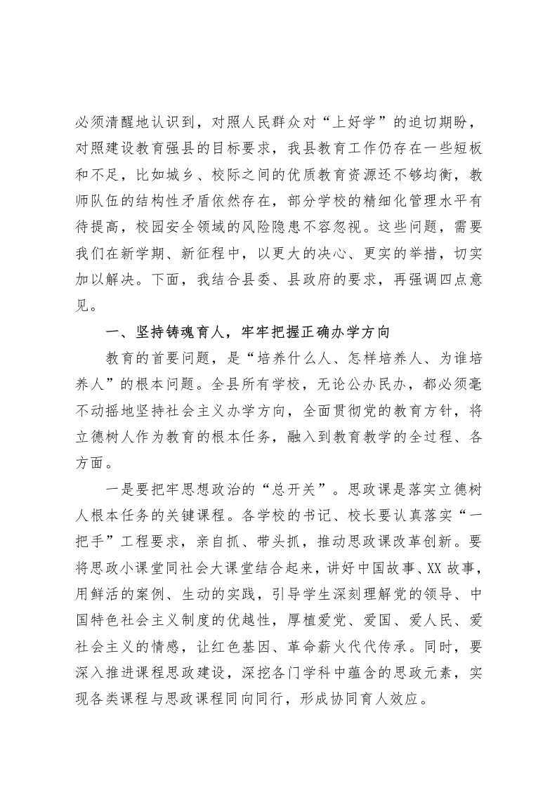 在XX县2025年秋季学期教育工作会议上的讲话(精品)同志们,老师们:大家好!今天,在这里召开全县2025年秋季学期教育工作会议。这次会议的主要任务是,总结上半年工作,分析当前形势,部署新学期任务,动员全县教育战线的同志们凝心聚力、开拓进取,奋力谱写XX县教育高质量发展的新篇章。刚才,XX局长全面总结了我县上半年教育工作取得的成绩,客观分析了存在的问题,并对新学期的重点工作作出了周密部署,我都完全赞同。他的报告思路清晰、重点突出、措施有力,希望大家认真领会,抓好落实。教育是国之大计、党之大计,承载着万千家庭的希望,关系着XX县的未来。县委、县政府始终坚持教育优先发展战略,将办好人民满意的教育作为最重要的民生工程来抓。上半年,在全县广大教育工作者的共同努力下,我们的教育事业取得了可喜的成绩,办学条件持续改善,教育质量稳步提升,教师队伍充满活力,校园安全基本稳定。这些成绩的取得,凝聚着在座各位以及全县一万多名教职员工的智慧、心血和汗水。在此,我代表县委、县政府,向辛勤耕耘在教育战线上的全体教职员工,致以崇高的敬意和衷心的感谢!站在新的起点,我们既要肯定成绩,更要正视挑战。我们