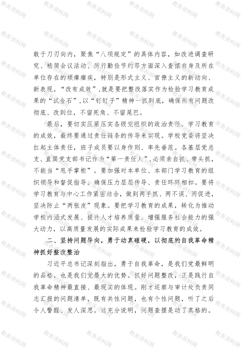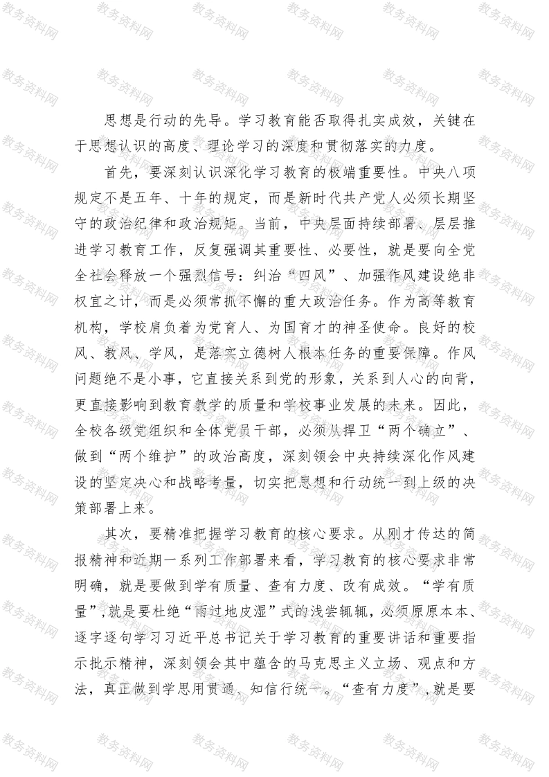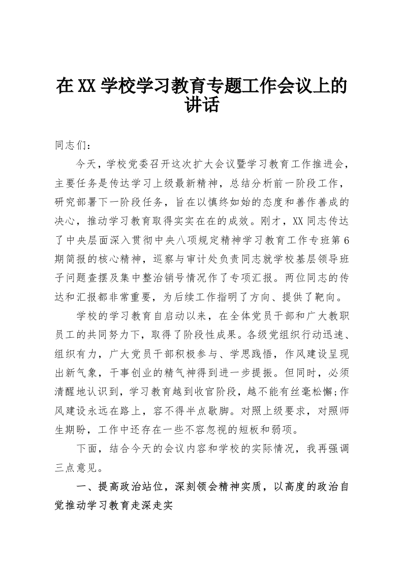 在XX学校学习教育专题工作会议上的讲话同志们:今天,学校党委召开这次扩大会议暨学习教育工作推进会,主要任务是传达学习上级最新精神,总结分析前一阶段工作,研究部署下一阶段任务,旨在以慎终如始的态度和善作善成的决心,推动学习教育取得实实在在的成效。刚才,XX同志传达了中央层面深入贯彻中央八项规定精神学习教育工作专班第6期简报的核心精神,巡察与审计处负责同志就学校基层领导班子问题查摆及集中整治销号情况作了专项汇报。两位同志的传达和汇报都非常重要,为后续工作指明了方向、提供了靶向。学校的学习教育自启动以来,在全体党员干部和广大教职员工的共同努力下,取得了阶段性成果。各级党组织行动迅速、组织有力,广大党员干部积极参与、学思践悟,作风建设呈现出新气象,干事创业的精气神得到进一步提振。但同时,必须清醒地认识到,学习教育越到收官阶段,越不能有丝毫松懈;作风建设永远在路上,容不得半点歇脚。对照上级要求,对照师生期盼,工作中还存在一些不容忽视的短板和弱项。下面,结合今天的会议内容和学校的实际情况,我再强调三点意见。一、提高政治站位,深刻领会精神实质,以高度的政治自觉推动学习教育走深走实