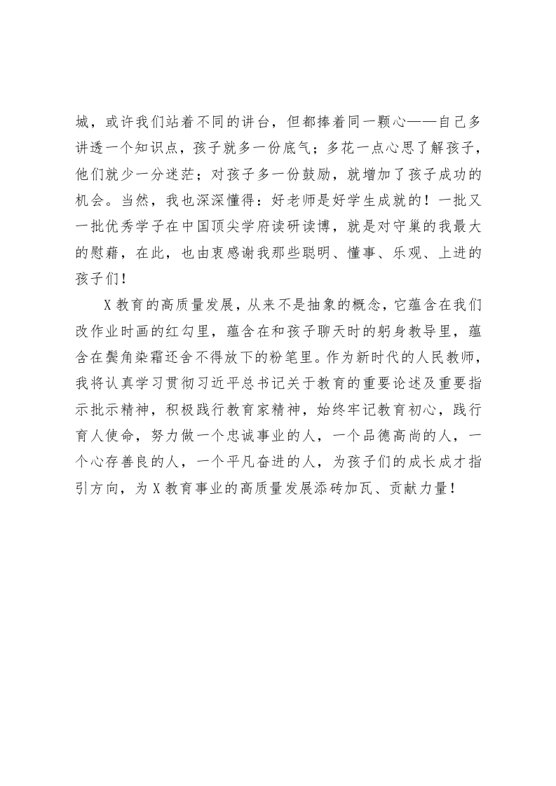 在全市教育高质量发展大会上的发言:坚守教育初心,奉献三尺讲台从教19年来,我一直担任数学教学和班主任工作。今天,能获得“X市新时代好班主任”这个荣誉,并作为教师代表在此发言,深感荣幸,备受鼓舞,真诚感谢组织的信任与勉励,也感谢时代赋予我们教书育人这份神圣而光荣的使命。“把教育职业当做事业来做”是我的从教初心。2006年参加工作,分配到离县城最远的古城学校任教,黄土塬上的风很烈,但心里的灯却很明,因为我爱教书、爱课堂、更爱孩子。从那时起,我就下定决心,要把自己的全部身心投入到教学工作上,把满腔热血挥洒在教育这片沃土上。六年的农村教学生涯,让我深切地感受到,越是基层越需要优秀的老师,越是偏远越需要优质的教育。2012年,通过回城选拔,我到了府谷县第二中学任教,讲台变了,学生也变了,但手里的粉笔没有变,心里的牵挂、心里对学生的爱和对这份事业的执着没有变,找到每个孩子的“闪光点”,帮他们长大,助他们前行的使命没有变。因为教育不分地域,只有情怀!“把别人家的孩子当成自己家的来教”是我的育人使命。在担任班主任的19个春秋里,无论工作多么繁忙,生活中有多少烦恼,我总是面带微笑走进课堂,用书桌旁的循循善诱、生活中的无微不至、家访时的苦口婆心来迎接孩子们期盼与渴求的目光,换取孩子们会心的微笑和茁壮的成长。从黄土塬到县