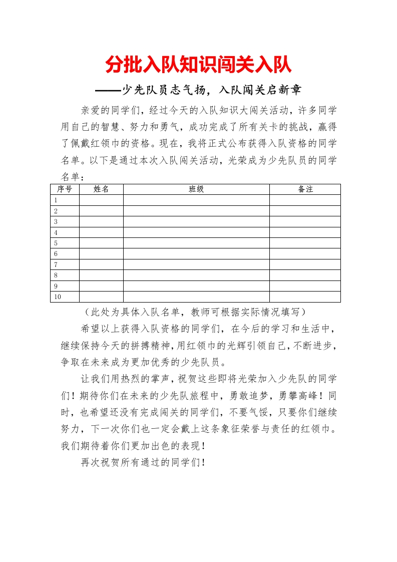 分批入队知识闯关入队一少先队员志气扬,入队闯关启新章亲爱的同学们,经过今天的入队知识大闯关活动,许多同学用自己的智慧、努力和勇气,成功完成了所有关卡的挑战,赢得了佩戴红领巾的资格。现在,我将正式公布获得入队资格的同学名单。以下是通过本次入队闯关活动,光荣成为少先队员的同学名单:序号姓名班级备注12345678910(此处为具体入队名单,教师可根据实际情况填写)希望以上获得入队资格的同学们,在今后的学习和生活中,继续保持今天的拼搏精神,用红领巾的光辉引领自己,不断进步,争取在未来成为更加优秀的少先队员。让我们用热烈的掌声,祝贺这些即将光荣加入少先队的同学们!期待你们在未来的少先队旅程中,勇敢追梦,勇攀高峰!同时,也希望还没有完成闯关的同学们,不要气馁,只要你们继续努力,下一次你们也一定会戴上这条象征荣誉与责任的红领巾。我们期待着你们更加出色的表现!再次祝贺所有通过的同学们!