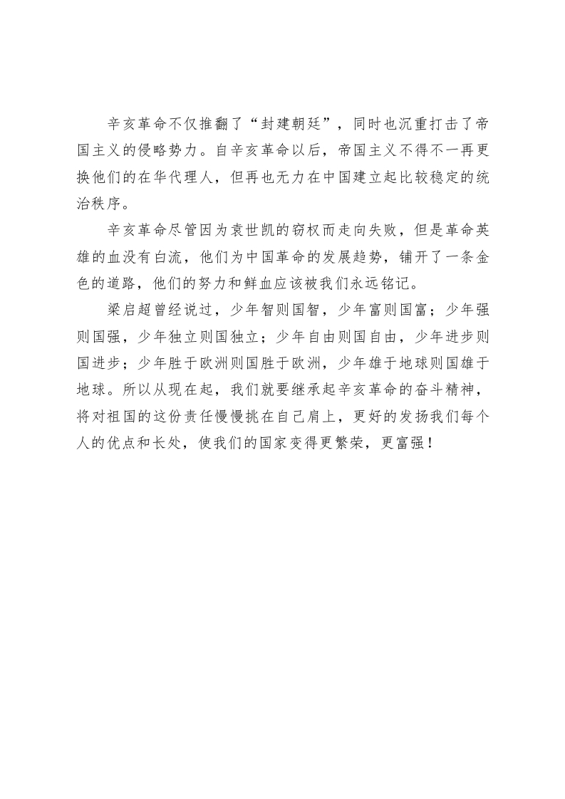 10月10日辛亥革命纪念日,校长在国旗下讲话尊敬的老师们,亲爱的同学们:上午好!时隔一个多星期,大家一定都还记得在运动场上挥洒汗水,奋力搏击的一幕幕场景吧,那里曾经有过胜利者的欢歌笑语,有过失败者的暗自垂泪。但无论是成功者还是失败者,他们都是我们的英雄,因为他们都曾努力过,不仅挑战了自己还为我们的学校增添了精彩,就因为这个理由,我要向所有的运动员致敬,为了他们的'成功也为了他们的失败。今天,同样需要我们致敬的是100多年前的一群英雄们,他们不畏强权,殊死奋战,终于推翻了清王朝二百六十多年的专制统治,结束了中国历时两千多年的封建帝制。他们就是所有参加辛亥革命的英雄们。1911年10月10日武昌起义一声枪响,标志着辛亥革命的全面爆发。每年的10月10日是辛亥革命纪念日。在这之前,以孙中山为首的资产阶级革命派宣传革命理论,组织革命政党,先后发动过十次武装起义,虽然遭到了失败,但每次起义都起到了宣传革命,振奋人心的作用。就是经过这种量的不断累积,终于迎来了武昌起义的胜利。辛亥革命推翻了清王朝二百六十多年的专制统治,结束了两千多年的封建君主专制制度,建立了资产阶级共和国,给了封建专制制度以致命的一击。