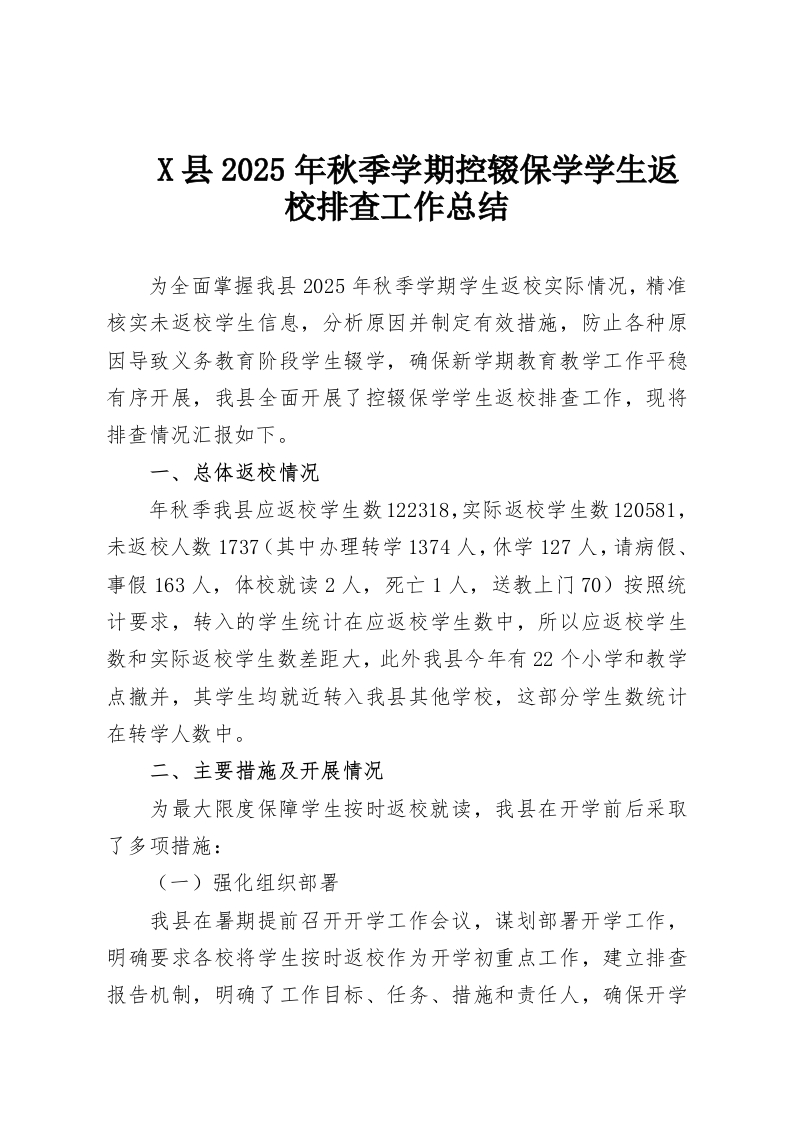 X县2025年秋季学期控辍保学学生返校排查工作总结为全面掌握我县2025年秋季学期学生返校实际情况,精准核实未返校学生信息,分析原因并制定有效措施,防止各种原因导致义务教育阶段学生辍学,确保新学期教育教学工作平稳有序开展,我县全面开展了控辍保学学生返校排查工作,现将排查情况汇报如下。一、总体返校情况年秋季我县应返校学生数122318,实际返校学生数120581,未返校人数1737(其中办理转学1374人,休学127人,请病假、事假163人,体校就读2人,死亡1人,送教上门70)按照统计要求,转入的学生统计在应返校学生数中,所以应返校学生数和实际返校学生数差距大,此外我县今年有22个小学和教学点撤并,其学生均就近转入我县其他学校,这部分学生数统计在转学人数中。二、主要措施及开展情况为最大限度保障学生按时返校就读,我县在开学前后采取了多项措施:(一)强化组织部署我县在暑期提前召开开学工作会议,谋划部署开学工作,明确要求各校将学生按时返校作为开学初重点工作,建立排查报告机制,明确了工作目标、任务、措施和责任人,确保开学