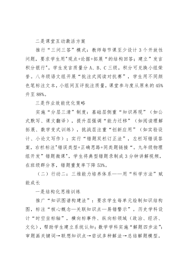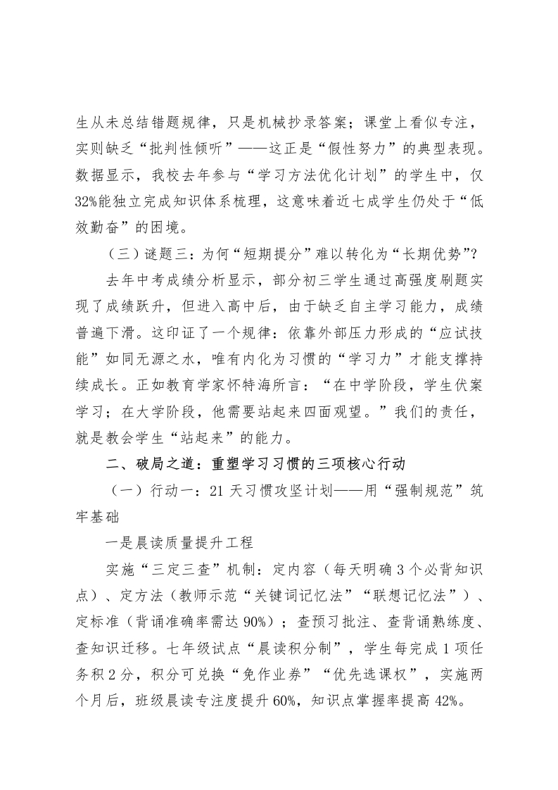 副校长在全体教师大会上发言:破解三大难题,重塑学习习惯,提升教学质量各位老师,大家好!今天,我们召开全体教师大会,共同探讨一个核心命题:为何在相同的教学投入下,学生成绩却呈现“冰火两重天”?为何有些学生总能自主规划学习,而有些学生却始终依赖教师催促?这些问题的答案,藏在“学习力”这把钥匙里。今天,我将围绕“破解三大难题、落实三项行动、实现三个转变”的思路,与大家分享如何通过习惯养成激活学生内驱力,让教学质量实现从“被动提升”到“主动生长”的跨越。一、直面教学痛点:揭开成绩差异背后的三大谜题(一)谜题一:为何“同样的课堂”产生“不同的结果”?在高一年级数学公开课上,我们观察到两组典型现象:前排学生用三色笔标注知识点,课后主动找老师探讨解题思路:而后排学生全程低头抄写板书,课后作业中80%的错题与课堂例题高度相似。这种差异的根源,在于学生是否掌握“主动加工知识”的能力。当部分学生还在被动接收信息时,另一部分学生已经通过“标注疑问一主动提问一迁移应用”的闭环完成了知识内化。(二)谜题二:为何“勤奋的表象”掩盖“低效的本质”?初二(7)班曾有位“刻苦型”学生,每天刷题到深夜,错题本整理了12本,成绩却始终徘徊在中游。深入分析发现,该