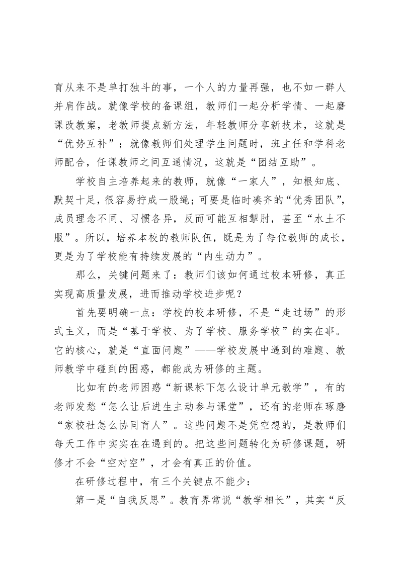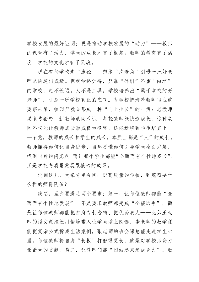 副校长在全体教师会上的发言:深耕校本研修,为学校高质量发展蓄能各位老师:大家下午好!最近这段时间,我校的校本研修一直在稳步推进一一从新课标解读的专题培训,到备课组里的同课异构,再到课后服务课程开发的研讨,不少老师都主动投入、积极探索。看着大家这份为教育琢磨、为学生用心的劲头,我既欣慰又感慨。今天把大家召集起来,就是想和大家掏心窝子聊一个话题:各位老师日常参与的校本研修,和学校要走的“高质量发展”路,到底是什么关系?各位老师又该如何让校本研修真正成为自身成长、学校进步的“助推器”?首先,大家得先想明白一个问题:什么是学校的“高质量发展”?可能有人会说,高质量发展是升学率提高、是获奖增多、是硬件升级。这些固然是发展的体现,但不是核心。在我看来,学校的高质量发展,归根结底是“人的发展”一一一方面是教师的发展,另一方面是学生的发展。教育领域常说“学校靠教师立校”,这话一点不假。一所学校最宝贵的资源,从来不是漂亮的教学楼,也不是先进的设备,而是在座的每一位老师。教师既是学校高质量发展的“成果”一一教师的专业能力提升了、教育理念更新了,本身就是