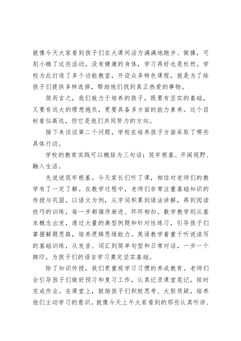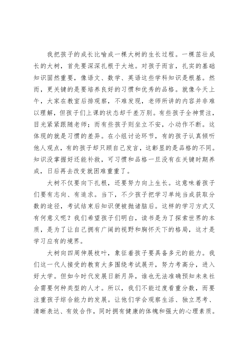 家长开放日活动校长总结讲话:不焦虑、不比较、不说教,重新定义家校共育尊敬的各位家长:大家好!今天,从清晨的第一缕阳光洒进校园,家长们就带着满满的关心和期待陆续走进这里。此刻已近中午,看到大家全程专注地陪伴在孩子身边,认真的模样甚至超过了孩子们,我内心满是感动。今天精心安排大家走进课堂、观看大课间,在校园各处走走看看,可不是简单的参观,而是希望借此机会,和大家深入探讨我们对教育的理解和追求。毕竟,孩子的成长,学校的教育只是一部分,回到家中,你们的教育引导同样不可或缺。教育,需要我们携手共进。接下来,我想围绕三个关键问题和大家展开交流:我们期望培养出怎样的孩子?学校为此采取了哪些措施?以及家校之间该如何紧密配合?先谈谈第一个问题,我们究竟要塑造什么样的孩子。这看似是个宏大的命题,实则与每位家长日常的抉择息息相关。比如,是让孩子多做几道练习题,还是多睡会儿养养精神?周末是送孩子去补习班,还是带他们投身大自然的怀抱?这些看似平常的选择背后,其实反映了家长们心中对“优秀孩子”的定义。