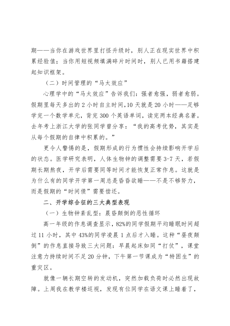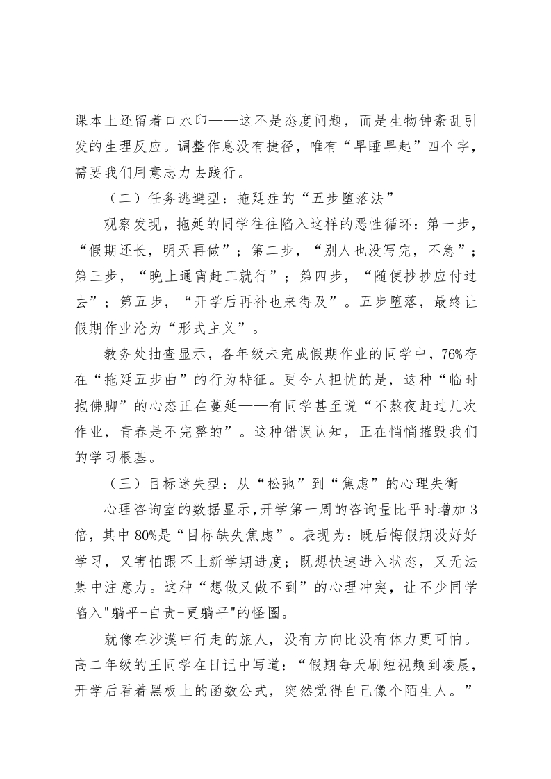 假期收心会校长讲话:破解“3天收心定律”,告别拖延症的五大陷阱亲爱的老师们、同学们:大家上午好!金秋九月,丹桂飘香。当熟悉的上课铃声再次在校园回荡,当琅琅书声重新唤醒沉睡的教室,我们共同站在了新学期的起跑线上。今天,我想和大家探讨一个关乎成长的核心命题一一如何在3天内完成从“假期模式”到“学习模式”的精准切换?为何同样的假期,有人实现弯道超车,有人却陷入“开学焦虑”?这背后,藏着自律与拖延的认知博弈,更关乎我们能否掌握人生的主动权。一、假期是面镜子:两种选择,两种人生(一)两种假期状态的真实对照这个国庆假期,我在教师群里看到两组照片:初三(2)班的李明同学每天7点准时出现在书房,制定了“上午攻克数学弱项,下午练习英语口语,晚间阅读名著”的作息表,假期结束时不仅完成了全部作业,还撰写了3篇研学日记;而另一位同学的假期则在"再睡10分钟”“明天再写作业”的自我妥协中度过,直到收假前一晚才在父母的催促下挑灯夜战。这两种状态的对比,恰如校园里的两棵梧桐树:一棵在假期默默扎根,开学后枝繁叶茂;另一棵在假期停止生长,春天便落后于人。假期不是用来放纵的驿站,而是自我提升的黄金