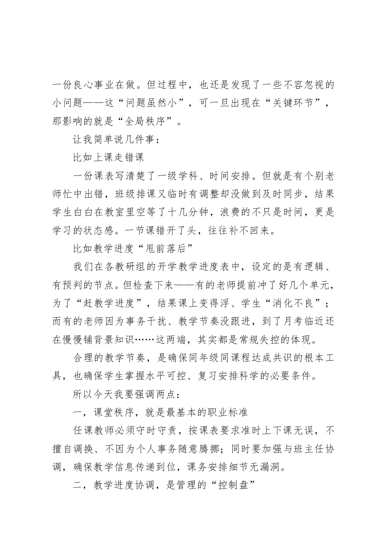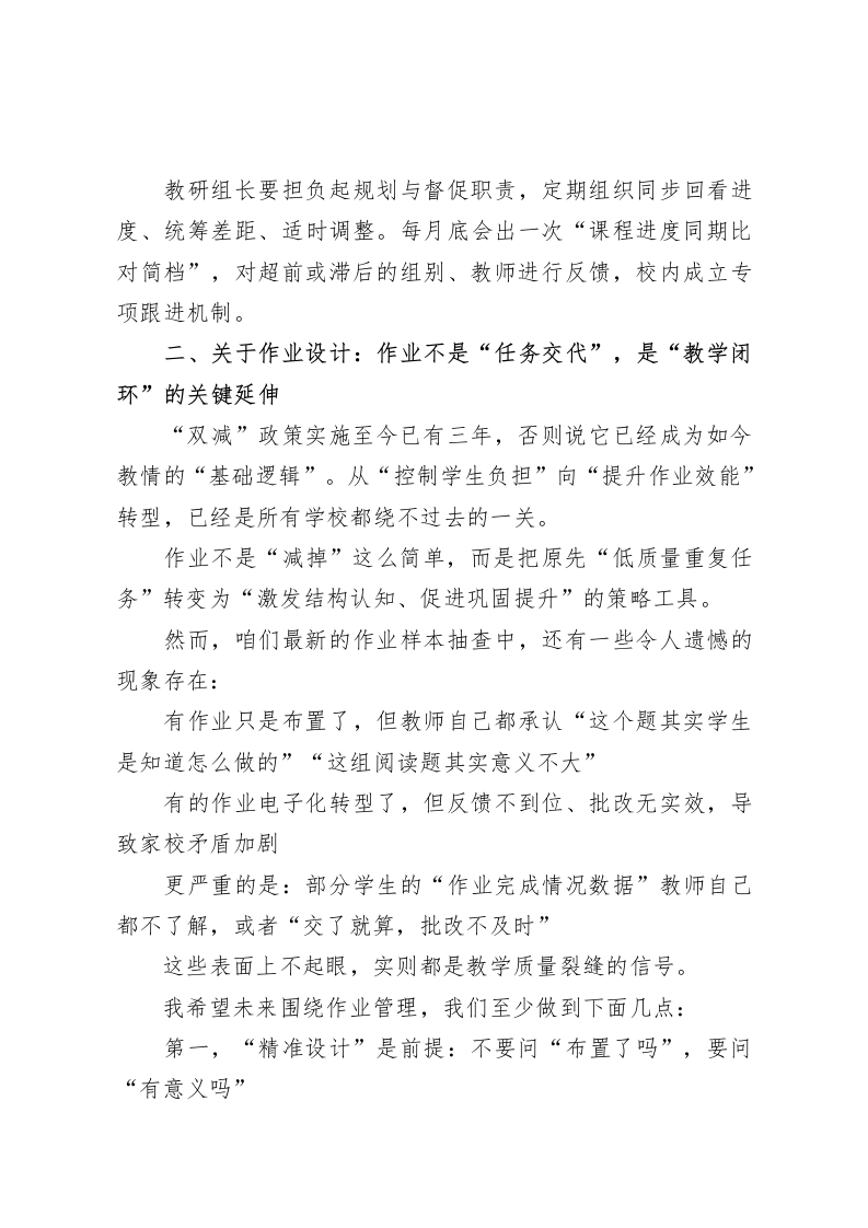 教研组长会议校长讲话:教研组长必须扛起的“五件真事”,虚的一个不讲!各位教研组长、全体老师们:大家下午好!很高兴我们今天能聚在一起,坐下来好好谈一谈关于教学的话题。开学已经过去一个多月,学校各项工作渐入正轨,也正是在这个阶段,最适合我们静下心来一一审一审已有的做法、查一查隐藏的问题、想一想下一步的方向。今天这个讲话,不长篇大论,不讲虚话套话,就围绕一个关键词来展开:“实”一一教学做得实不实、教师任务抓得实不实、课堂改革落得实不实。我主要从五个方面跟大家交流。一方面分享一些最近学校听课巡课、调研教研活动中的真实观察;另一方面也结合当前教学管理的新要求、新目标,给大家提一些建议和期待。一、关于教学常规:教学要“有规矩”,管理靠“扎实功”,这是最基本的底线咱们说“抓质量”,基础就是“抓常规”。教学常规不是空谈理想的形式规范,而是支撑学校正常运转、保障学生真实学习成果的一一制度之本、行为之根。我最近参与了多次巡课,随机抽查了一些年级、班级和时段的课堂状态,也访问了几位教师的备课情况,总体来看:绝大多数老师工作态度认真,业务状态稳定,也确实把教育当成