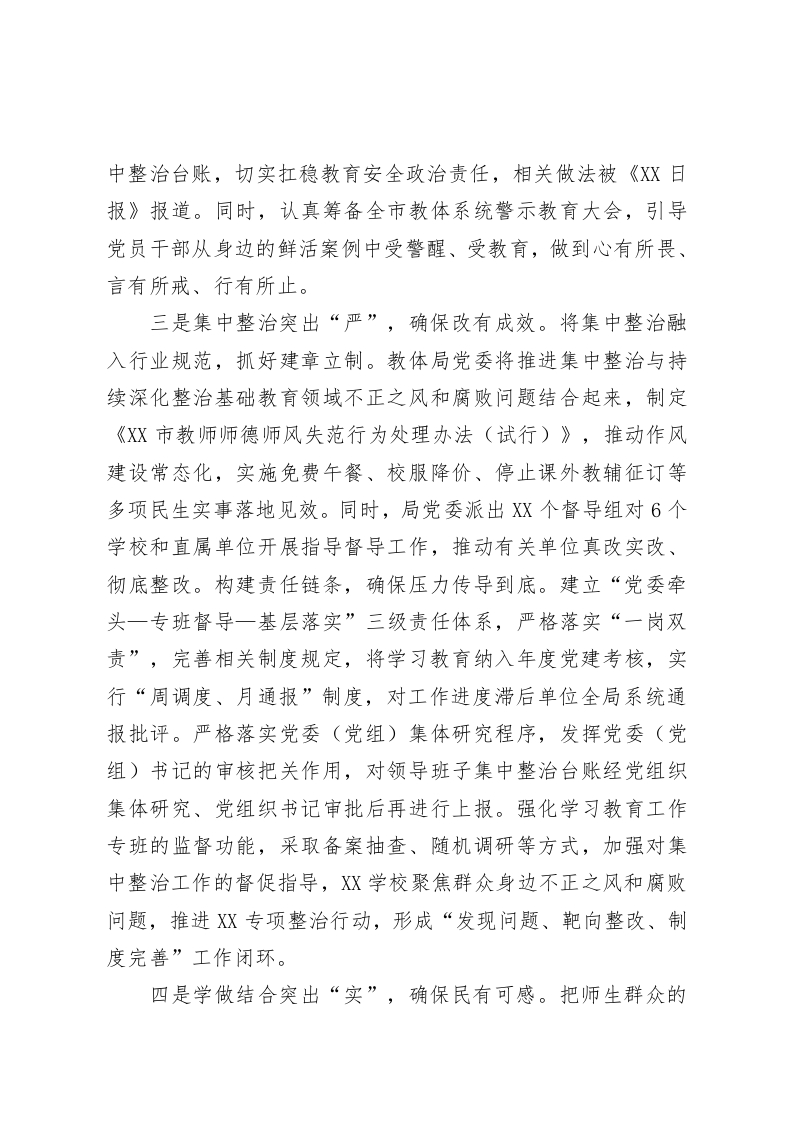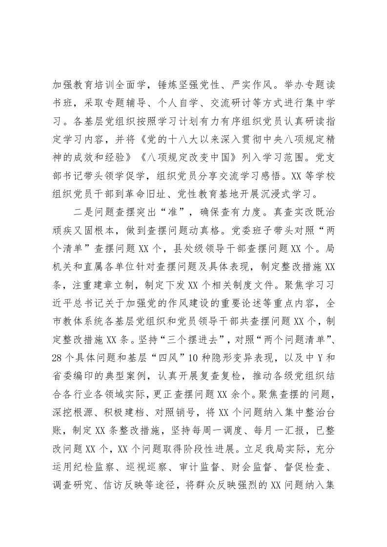 教育局党委专题工作总结(作风建设)为深入贯彻落实中央八项规定及其实施细则精神,持续深化作风建设,教育局结合实际推动各级党组织和广大党员干部在建设和美XX中展现新作为,切实将中央八项规定精神与新时代党的建设总要求融入日常、抓在经常。现将有关情况汇报如下:一、工作开展情况一是学习研讨突出“深”,确保学有质量。局党委坚决扛起学习教育政治责任,党委书记XX同志切实履行第一责任人职责,专题听取全局学习教育情况汇报,多次以“四不两直”形式深入乡镇和基层单位调研暗访,带动XX名党员领导于部和县级工作专班下沉各基层党组织开展调研指导XX次,发现制定学习教育工作安排不实、基本知识掌握不牢等问题XX个,并及时督促整改到位。坚持学习教育工作专班“周例会、半月梳理、月调度”制度,确保各地各单位党(工)委和基层党组织将学习教育落到实处。实施“三有”工作模式(有工作安排、有业务提示、有调度督促),认真谋划安排,精心组织实施,抓好工作落实,结合上级部署,定期制定学习教育重点任务安排,下发关于学习研讨、问题查摆等重点工作提示。定期发送学习教育指导提示,每月向基层党组织推送学习清单和相关资料,通过丰富学习形式,用好学习载体,推动学习教育入脑入心。坚持深学细悟,突出领导干部带头学,组织党员干部深入学,