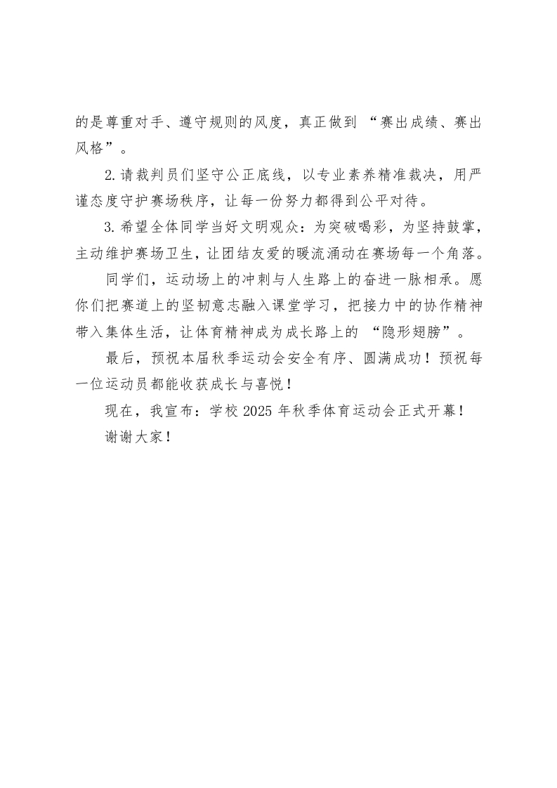 校长在2025年秋季体育运动会(开幕式)上的致辞尊敬的各位老师、裁判员,亲爱的同学们:大家上午好!金秋送爽,丹桂飘香,在这充满收获与活力的时节,我们齐聚绿茵场,共同迎来学校2025年秋季体育运动会的隆重开幕!首先,我谨代表学校,向精心筹备本届运动会的全体工作人员、班主任和体育老师们致以诚挚的感谢!向即将驰骋赛场的运动员们送上亲切的问候!向秉公执裁的裁判员们致以崇高的敬意!体育承载着国家强盛、民族振兴的梦想,更见证着少年成长的足迹。我校始终秉持“文明其精神,野蛮其体魄”的教育理念,将体育教育作为素质教育的核心阵地。从课间操的整齐律动到体育课的专业训练,从班级联赛的热血比拼到阳光体育的常态化开展,我们始终坚信:健全的体魄是追逐梦想的基石,拼搏的精神是人生路上的财富。正如“每天锻炼一小时,健康工作五十年,幸福生活一辈子”的理念所倡导的,运动不仅能强健筋骨,更能培育坚韧品格。今天的赛场,既是竞技的舞台,更是成长的课堂。在此,我向全体师生提出三点期望:1.愿运动员们秉持“更高、更快、更强-更团结”的奥运精神,在跑道上挥洒汗水,在沙坑中挑战自我,在接力赛中凝聚力量。记住,比成绩更珍贵的是坚持的勇气,比名次更重要