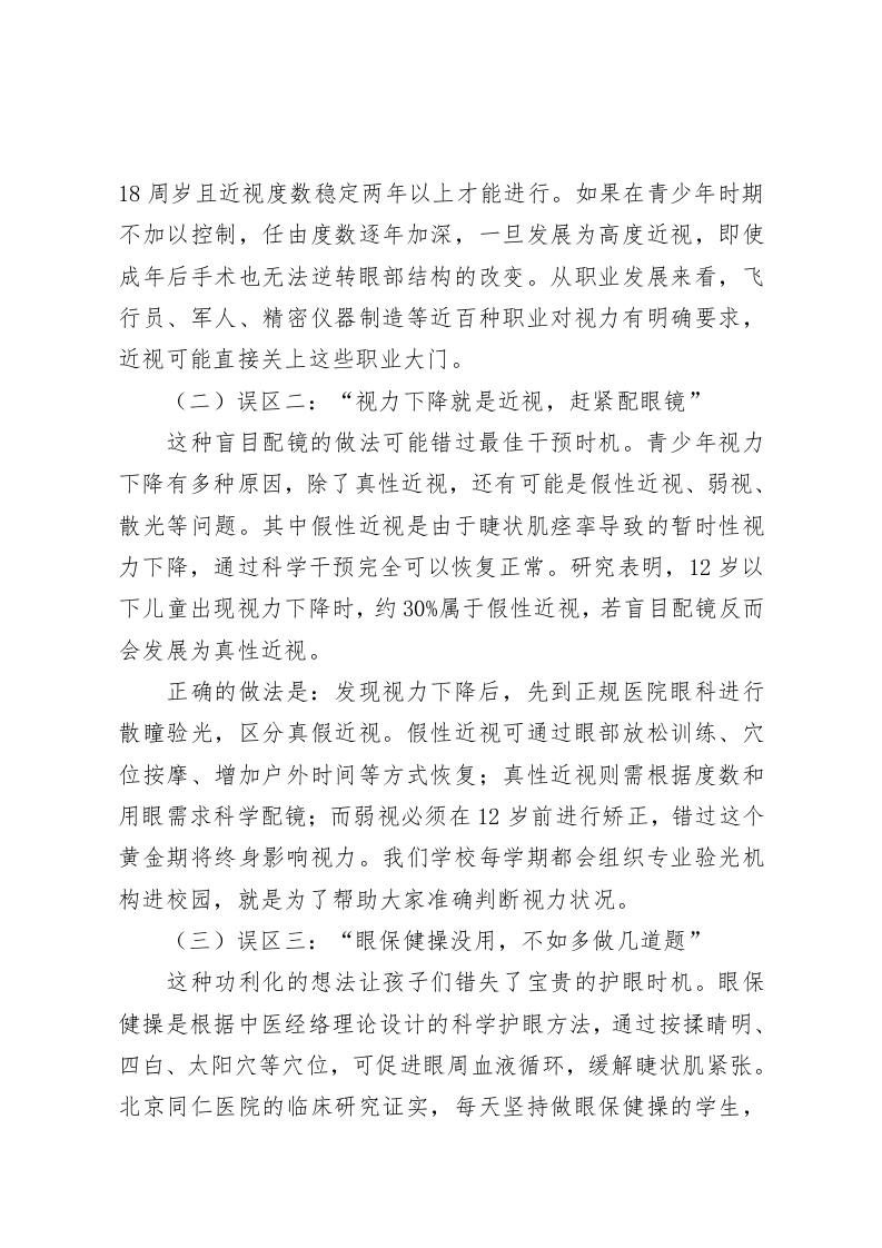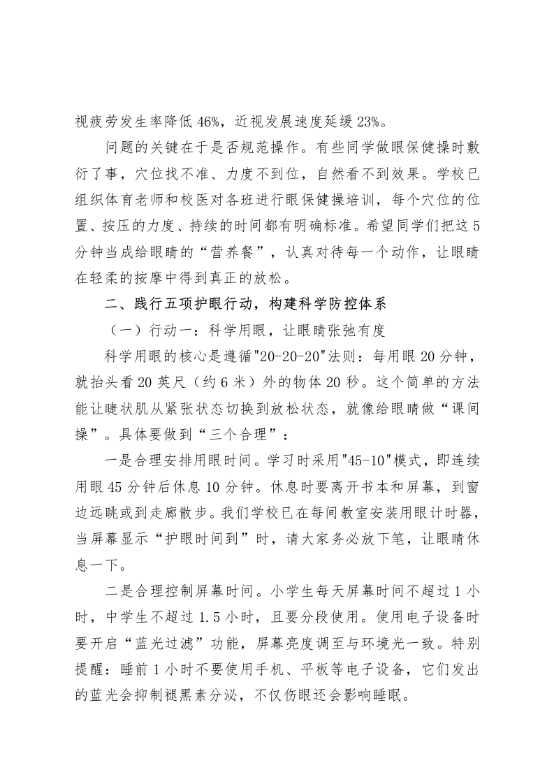 校长在近视防控宣传教育月活动上讲话:破解3大误区,践行5项行动尊敬的各位领导、老师,亲爱的同学们:大家下午好!当我们用眼睛捕捉清晨的第一缕阳光,当我们用目光追随黑板上跳跃的字符,当我们用眼神传递青春的喜怒哀乐,这扇“心灵之窗”正为我们打开一个五彩斑斓的世界。然而最新数据显示,我国青少年近视率已达53.6%,其中小学生近视率35.6%,初中生71.1%,高中生80.5%一一这组数字背后,是孩子们被模糊的视界,是未来职业选择的局限,是国家人才培养的隐忧。今天,我想和大家共同探讨三个被忽视的认知误区,践行五项科学的护眼行动,让每个孩子都能拥有一双清澈明亮的眼睛,看清梦想的方向,望见美好的未来。一、破解三大认知误区,树立科学防控观念(一)误区一:“近视只是小问题,长大做个手术就好”这种观点是对近视危害的严重低估。医学研究表明,近视手术只是通过切削角膜改变屈光状态,并不能改变眼轴变长的事实,更无法消除高度近视带来的眼底病变风险。临床数据显示,近视度数超过600度的高度近视患者,视网膜脱离的风险是正常人的10倍,白内障发生率增加3倍,青光眼风险提高2倍。而这些并发症,正是导致成年人视力残疾的主要原因。更值得警惕的是,近视手术有严格的年龄限制,必须年满