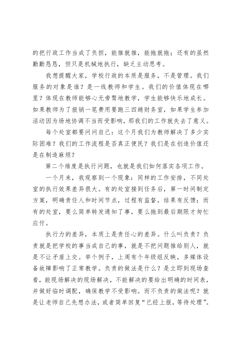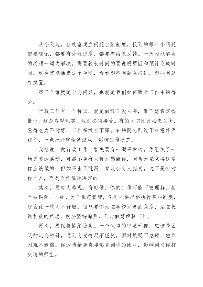 学校中层干部工作会议校长讲话:别让师生在你的办公室门前徘徊各位中层于部,同志们:今天召开这次会议,主要有三个目的:第一,对开学一个月来的行政工作进行阶段性反思;第二,直面当前管理中暴露出的突出问题;第三,明确下一阶段提升行政效能的具体举措。开学至今已经一个月了,学校各项工作基本步入正轨。但是,我在日常巡查和与师生交流中发现了一些值得警醒的现象:有教师反映,申请教学设备维修已经两周了,至今没有回应;有家长投诉,咨询转学事宜时被几个部门来回推诿;还有的处室,明明可以当场解决的问题,非要层层上报,让简单的事情复杂化。这些看似细小的问题,反映出我们行政管理中存在的深层次矛盾。我一直在思考一个问题:什么样的行政管理才是好的管理?我认为,最好的行政就是让师生感受不到行政的存在,因为所有的服务都已经做在了前面,所有的保障都已经落到了实处。就像空气一样,平时察觉不到,但却须臾不可缺少。今天,我想从四个维度来谈谈中层干部应该具备的基本素养和工作要求。第一个维度是定位问题,也就是我们为什么要做行政工作。我发现,不少同志走上行政岗位后,逐渐忘记了自己的初衷。有的把行政岗位当成了权力的象征,习惯于发号施令;有