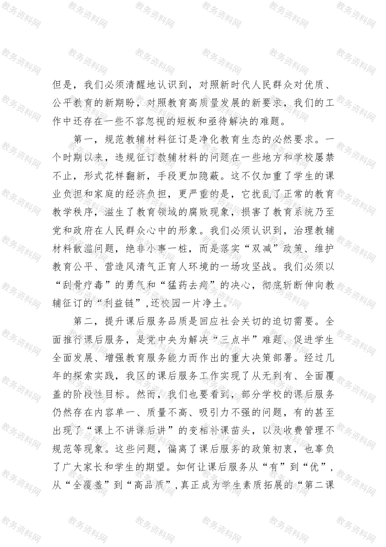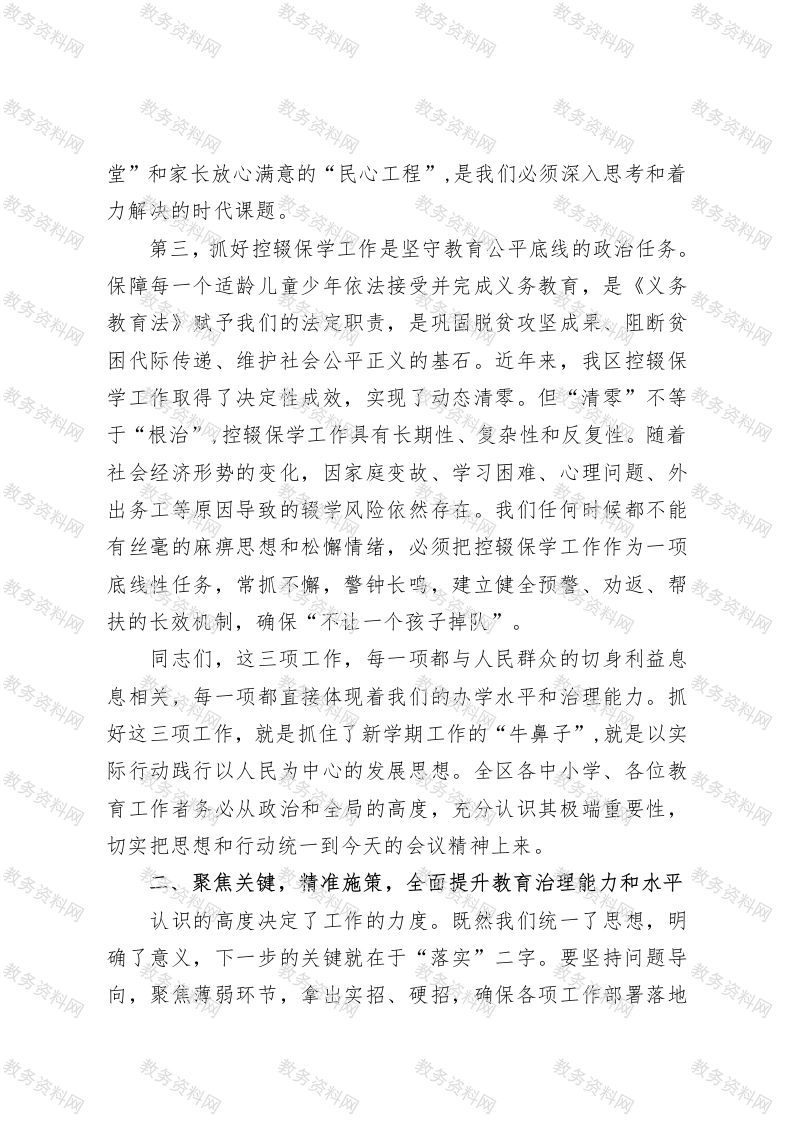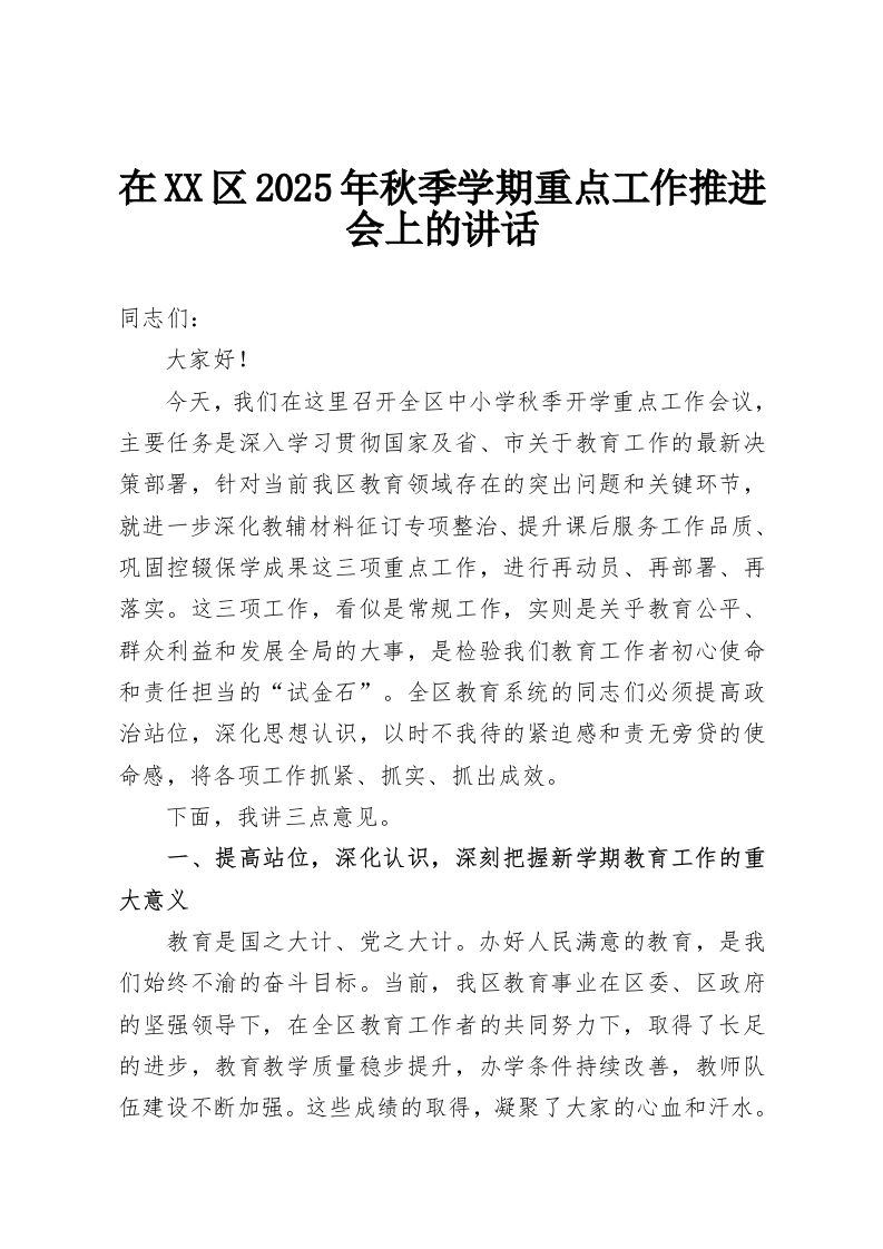在XX区2025年秋季学期重点工作推进会上的讲话同志们:大家好!今天,我们在这里召开全区中小学秋季开学重点工作会议,主要任务是深入学习贯彻国家及省、市关于教育工作的最新决策部署,针对当前我区教育领域存在的突出问题和关键环节,就进一步深化教辅材料征订专项整治、提升课后服务工作品质、巩固控辍保学成果这三项重点工作,进行再动员、再部署、再落实。这三项工作,看似是常规工作,实则是关乎教育公平、群众利益和发展全局的大事,是检验我们教育工作者初心使命和责任担当的“试金石”。全区教育系统的同志们必须提高政治站位,深化思想认识,以时不我待的紧迫感和责无旁贷的使命感,将各项工作抓紧、抓实、抓出成效。下面,我讲三点意见。一、提高站位,深化认识,深刻把握新学期教育工作的重大意义教育是国之大计、党之大计。办好人民满意的教育,是我们始终不渝的奋斗目标。当前,我区教育事业在区委、区政府的坚强领导下,在全区教育工作者的共同努力下,取得了长足的进步,教育教学质量稳步提升,办学条件持续改善,教师队伍建设不断加强。这些成绩的取得,凝聚了大家的心血和汗水。