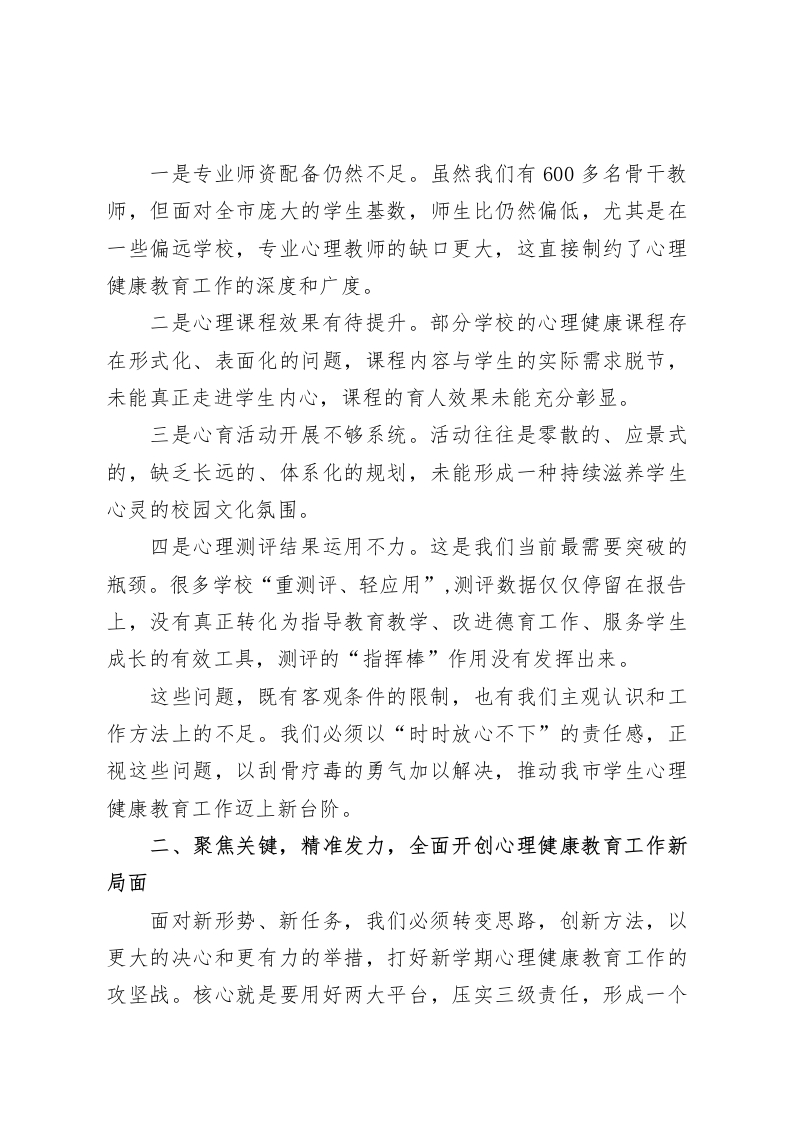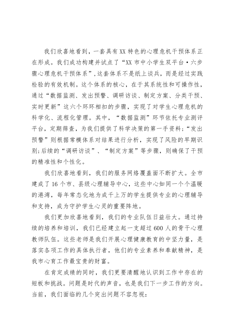 在XX市教体局2025年秋季学期中小学生心理评估及干预工作会上的讲话(精品)同志们,老师们:大家好!今天,我们在这里召开全市2025年秋季学期中小学生心理评估及干预工作会,主要任务是总结过去一个阶段我市中小学生心理健康教育工作的成效与不足,分析当前面临的新形势新挑战,并对新学期的重点工作进行全面部署。这次会议既是一次工作推进会,也是一次思想统一会、责任压实会。借此机会,我代表市教体局,向长期以来辛勤工作在学生心理健康教育一线的全体同仁,表示衷心的感谢和崇高的敬意!学生的心理健康,是学生全面发展、健康成长的根基,是教育质量的内在灵魂,更是社会和谐稳定的重要基石。我们必须深刻认识到,抓好这项工作,不仅仅是教育部门的业务工作,更是我们必须扛起的社会责任和时代使命。下面,我讲三点意见。一、肯定成绩,正视差距,深刻认识心理健康教育工作的极端重要性近年来,在市委、市政府的坚强领导下,在全市教育工作者的共同努力下,我市中小学生心理健康教育工作取得了长足的进步。我们的政策体系逐步完善,工作格局初步形成,专业能力持续提升。