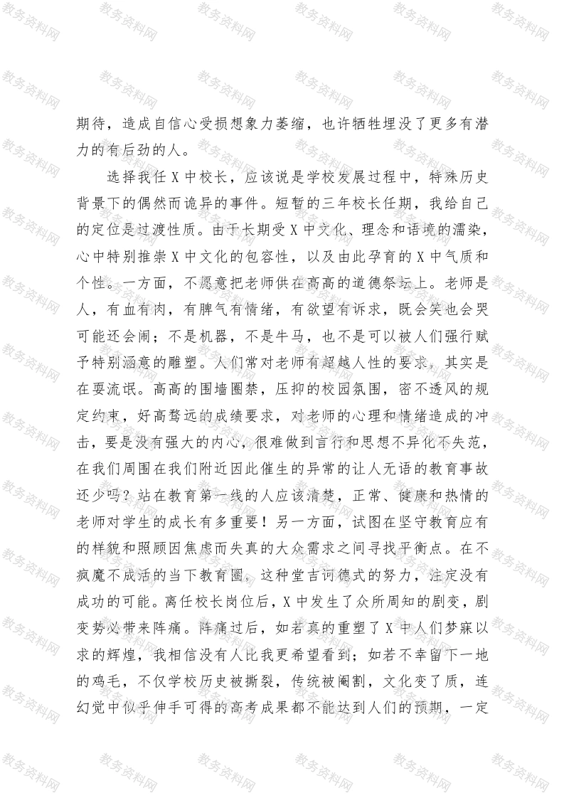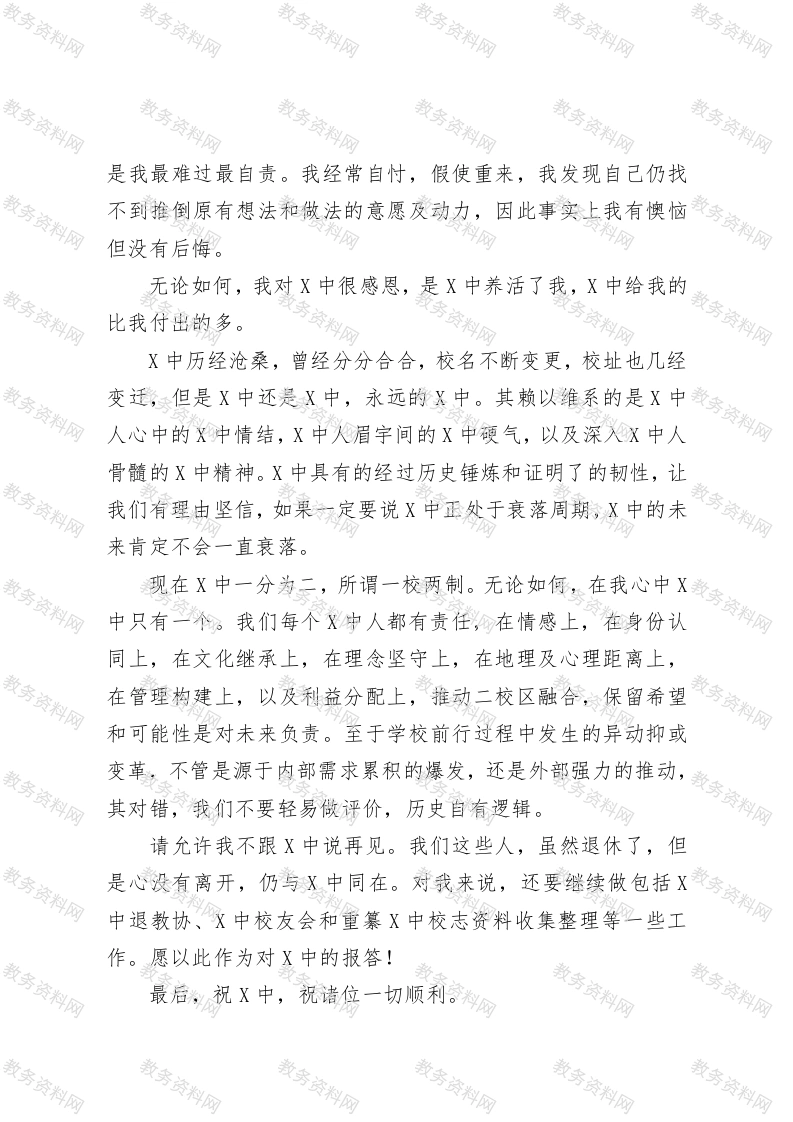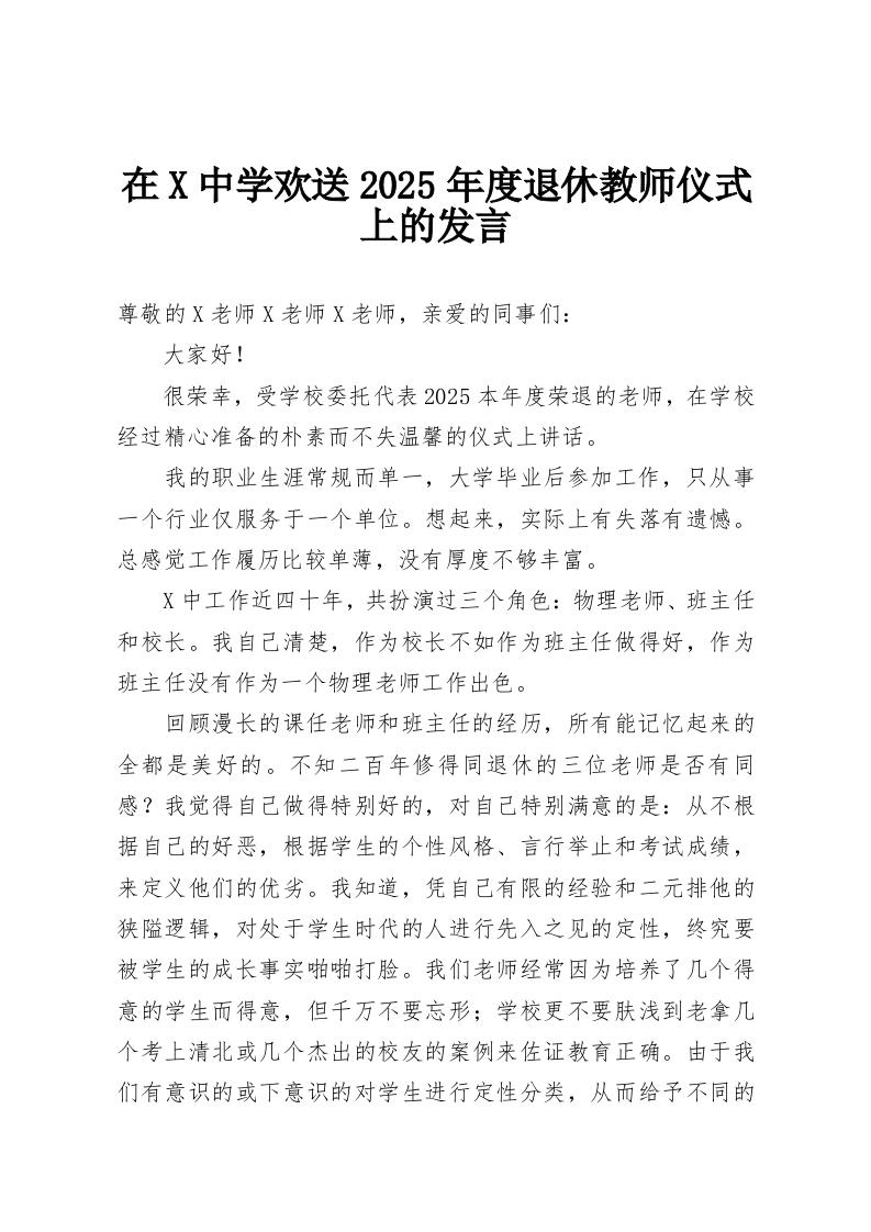 在X中学欢送2025年度退休教师仪式上的发言尊敬的X老师X老师X老师,亲爱的同事们:大家好!很荣幸,受学校委托代表2025本年度荣退的老师,在学校经过精心准备的朴素而不失温馨的仪式上讲话。我的职业生涯常规而单一,大学毕业后参加工作,只从事一个行业仅服务于一个单位。想起来,实际上有失落有遗憾。总感觉工作履历比较单薄,没有厚度不够丰富。X中工作近四十年,共扮演过三个角色:物理老师、班主任和校长。我自己清楚,作为校长不如作为班主任做得好,作为班主任没有作为一个物理老师工作出色。回顾漫长的课任老师和班主任的经历,所有能记忆起来的全都是美好的。不知二百年修得同退休的三位老师是否有同感?我觉得自己做得特别好的,对自己特别满意的是:从不根据自己的好恶,根据学生的个性风格、言行举止和考试成绩,来定义他们的优劣。我知道,凭自己有限的经验和二元排他的狭隘逻辑,对处于学生时代的人进行先入之见的定性,终究要被学生的成长事实啪啪打脸。我们老师经常因为培养了几个得意的学生而得意,但千万不要忘形:学校更不要肤浅到老拿几个考上清北或几个杰出的校友的案例来佐证教育正确。由于我们有意识的或下意识的对学生进行定性分类,从而给予不同的
