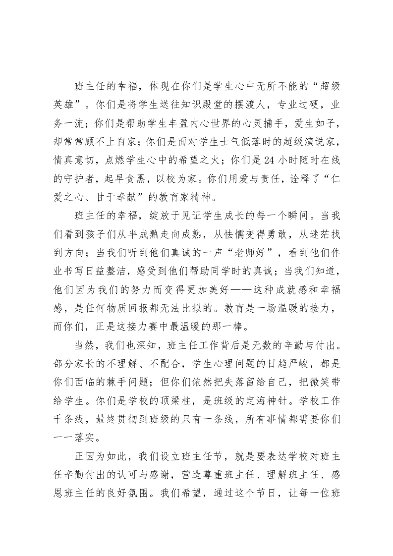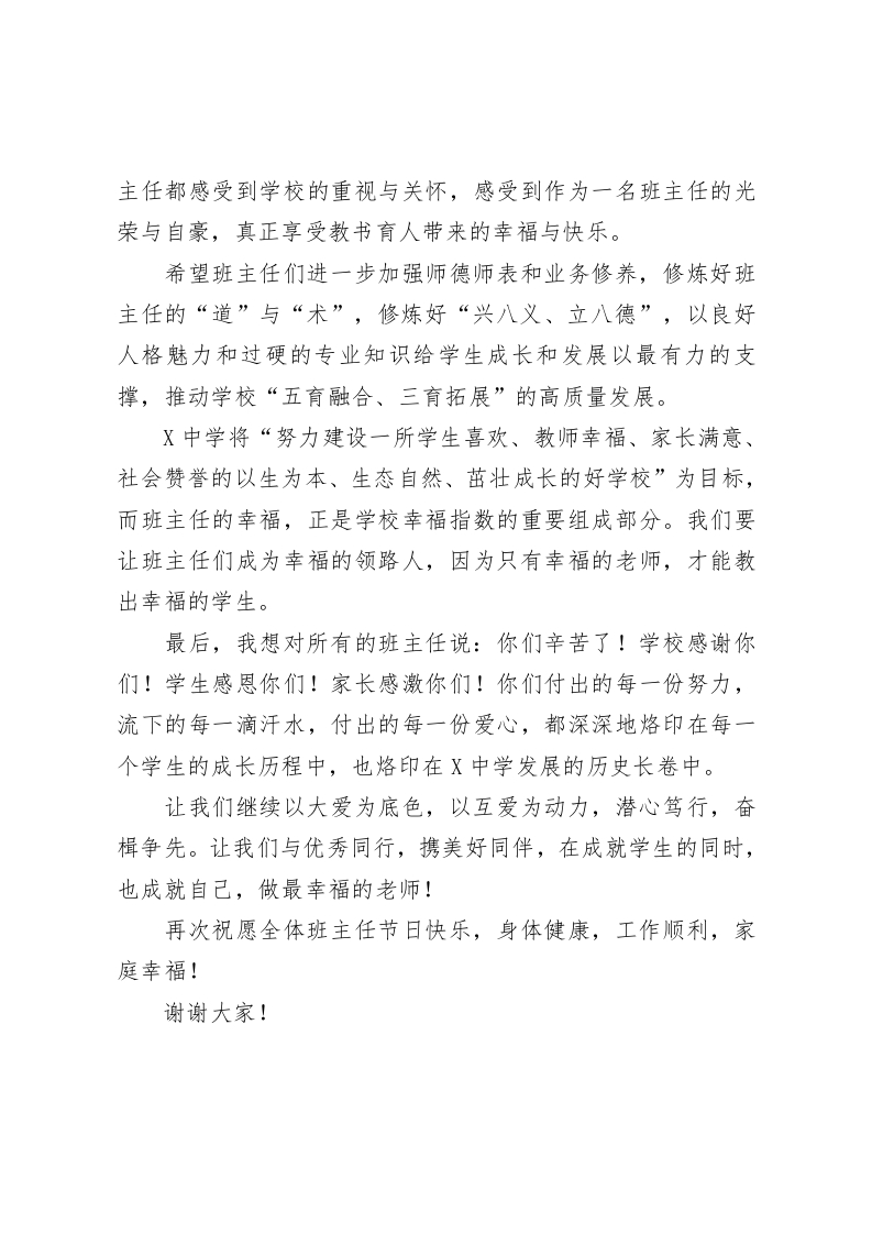 在X中学首届班主任节上的致辞:班主任是最幸福的老师尊敬的各位班主任:大家好!今天,我们怀着无比喜悦和崇敬的心情,齐聚在这里,共同庆祝X中学首届班主任节。在此,我代表学校,向全体班主任老师致以最诚挚的节日祝福和最崇高的敬意!你们辛苦了!班主任是教师群体中的骨干,是学校德育工作的中坚力量,是学生健康成长的引路人。我认为,对学生一生影响最大的是班主任,班主任对学生的教育是无可替代的,班主任是最幸福的老师;一位学生遇到一位好的班主任是学生的大幸,一个学校拥有一批卓越的班主任是学校的光荣。这句话,在X中学将得到生动的诠释。班主任的幸福,源于你们是学生心灵的导师,是成长的引路人。你们与学生朝夕相处,用心倾听他们的声音,理解他们的需求,引导他们走向正确的道路。这种用生命影响生命、用心灵唤醒心灵的过程,本身就是一种深刻的幸福。记得有一位班主任,为了帮助一个内向的孩子,每周坚持抽出时间与他交流,从他喜爱的书籍聊起,慢慢打开他的心扉,最终让这个孩子变得开朗自信。这样的故事,在你们中间还有许多许多。你们以心灵之火点燃学生的成长渴望,用点滴微光汇聚成照亮学生未来的人生大道。