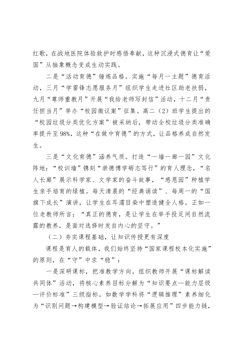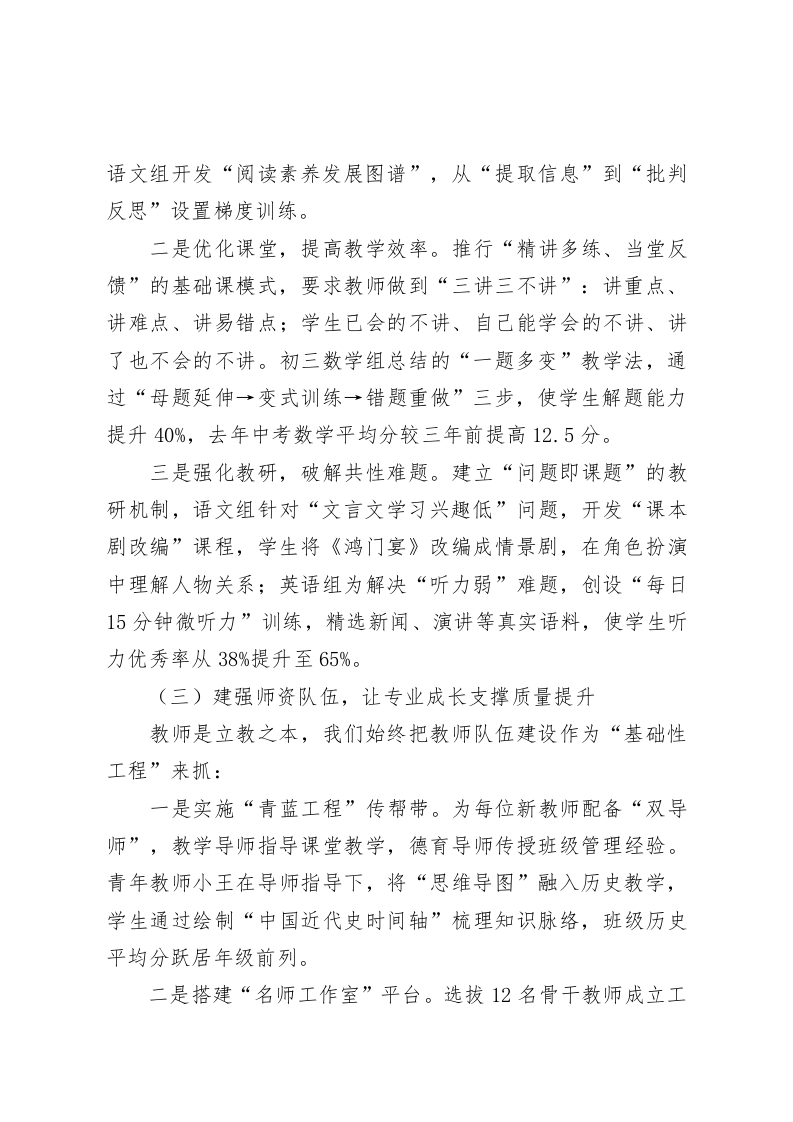 在教育质量提升经验交流会上,校长讲话:守正创新育桃李,培根铸魂立根基尊敬的各位教育同仁、各位领导:大家上午好!春潮涌动处,扬帆奋进时。今天,我们齐聚这座教育名城,共探教育高质量发展的路径与方法,既是对教育初心的回望,更是对育人使命的再出发。刚才几位校长的分享,既有“大刀阔斧”的改革魄力,又有“精雕细琢”的育人智慧,让我深受启发、倍感振奋。作为一所县域普通中学的校长,我常常思考:当“升学率”的指挥棒与“育人”的本质要求相遇,我们该如何坚守教育本真?当传统教学模式与新时代学生认知特点碰撞,我们又该如何破局突围?今天,我愿以“守正创新”为主线,分享我校从“规模扩张”到“内涵发展”的十年探索,与各位同仁共同解码教育质量提升的核心要义。一、守育人初心之正,筑牢质量提升的根基(一)坚持立德树人,让价值观引领成长方向“培养什么人、怎样培养人、为谁培养人”是教育的根本问题。我们始终把德育摆在首位,构建“三维德育”体系:一是“课程育德”浸润心灵。将社会主义核心价值观融入学科教学,开发《红色校本课程》,通过“革命家书诵读”“校史中的爱国故事”等主题活动,让红色基因代代相传。去年开展的“重走长征路”研学活动,学生们在翻越模拟雪山时高唱