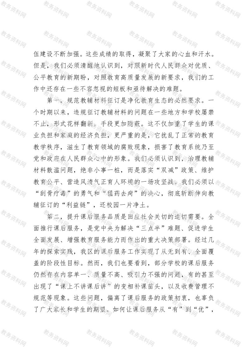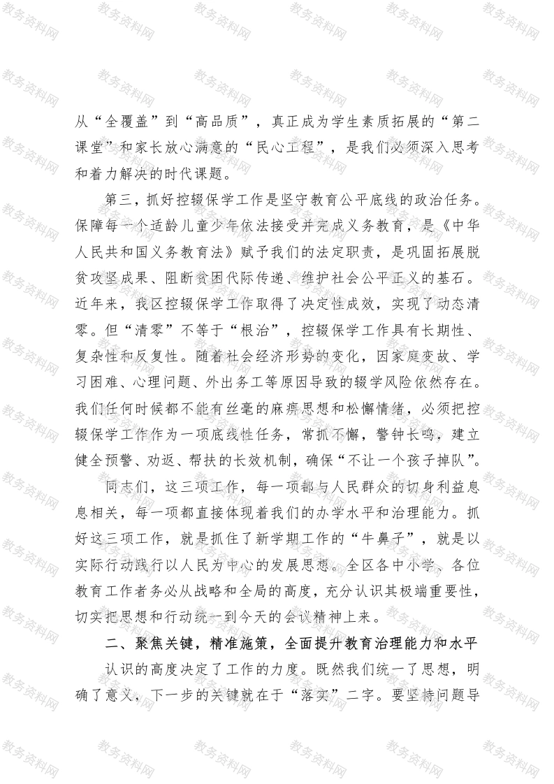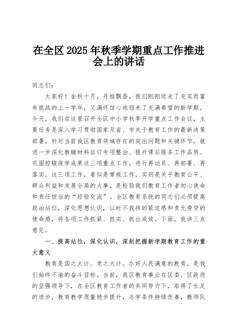 在全区2025年秋季学期重点工作推进会上的讲话同志们:大家好!金秋十月,丹桂飘香。我们刚刚送走了充实而富有挑战的上一学年,又满怀信心地迎来了充满希望的新学期。今天,我们在这里召开全区中小学秋季开学重点工作会议,主要任务是深入学习贯彻国家及省、市关于教育工作的最新决策部署,针对当前我区教育领域存在的突出问题和关键环节,就进一步深化教辅材料征订专项整治、提升课后服务工作品质、巩固控辍保学成果这三项重点工作,进行再动员、再部署、再落实。这三项工作,看似是常规工作,实则是关乎教育公平、群众利益和发展全局的大事,是检验我们教育工作者初心使命和责任担当的“经验交流”。全区教育系统的同志们必须提高政治站位,深化思想认识,以时不我待的紧迫感和责无旁贷的使命感,将各项工作抓紧、抓实、抓出成效。下面,我讲三点意见。一、提高站位,深化认识,深刻把握新学期教育工作的重大意义教育是国之大计、党之大计。办好人民满意的教育,是我们始终不渝的奋斗目标。当前,我区教育事业在区委、区政府的坚强领导下,在全区教育工作者的共同努力下,取得了长足的进步,教育教学质量稳步提升,办学条件持续改善,教师队