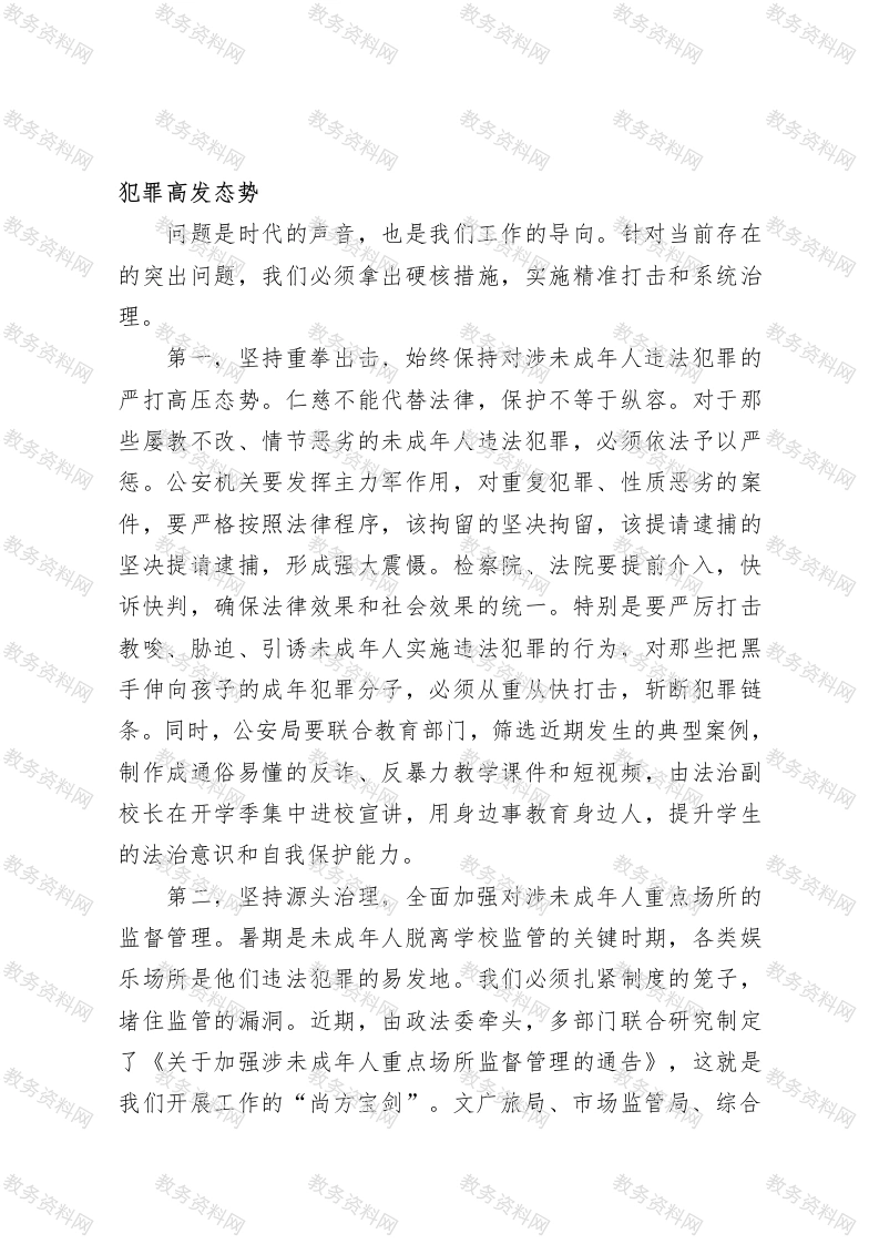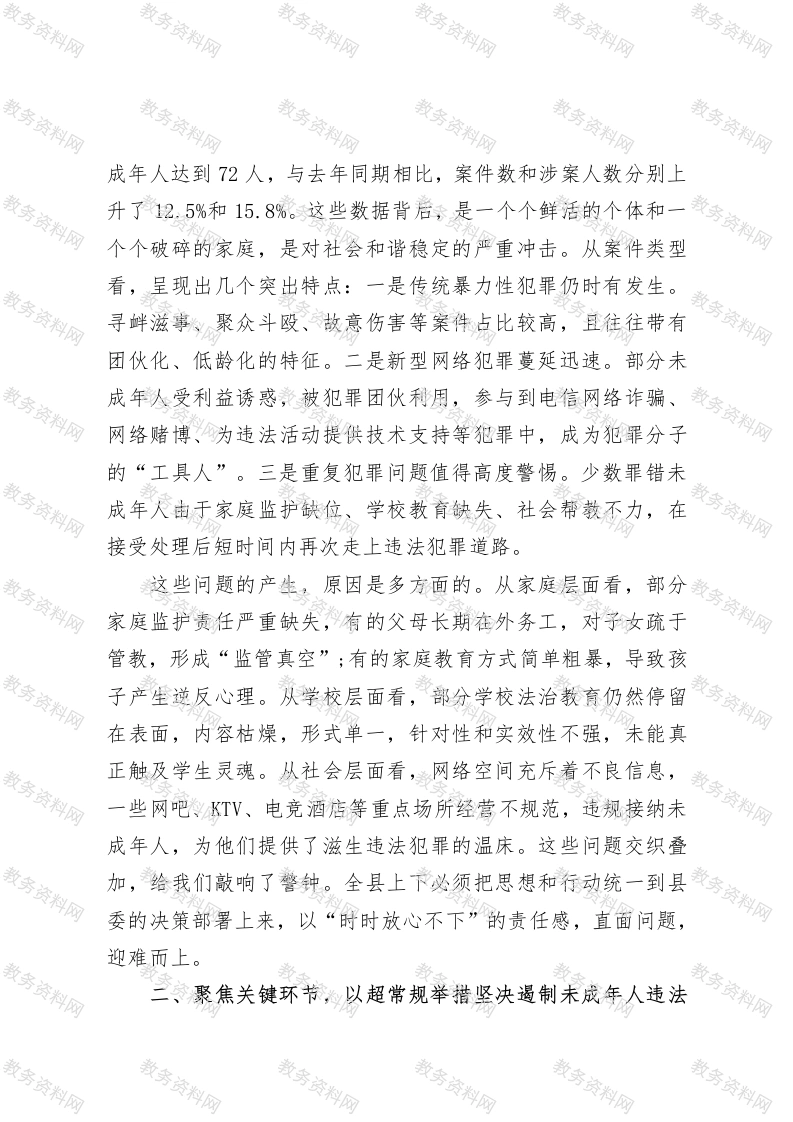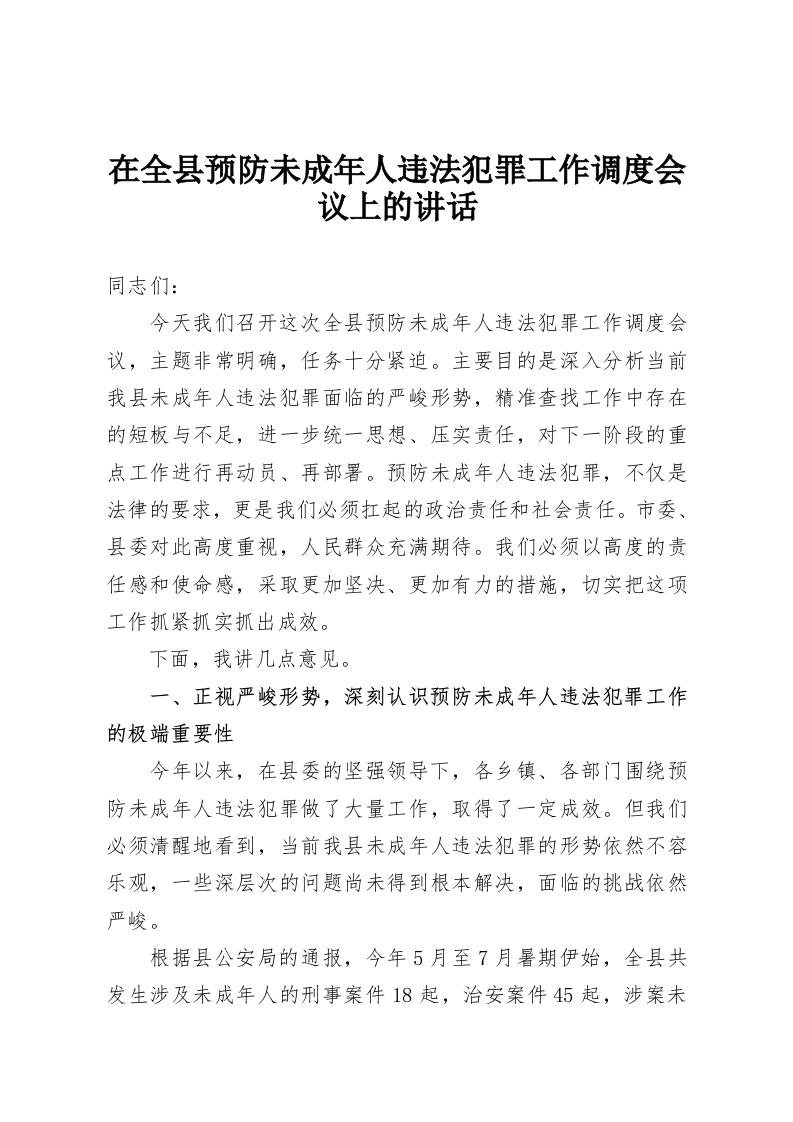 在全县预防未成年人违法犯罪工作调度会议上的讲话同志们:今天我们召开这次全县预防未成年人违法犯罪工作调度会议,主题非常明确,任务十分紧迫。主要目的是深入分析当前我县未成年人违法犯罪面临的严峻形势,精准查找工作中存在的短板与不足,进一步统一思想、压实责任,对下一阶段的重点工作进行再动员、再部署。预防未成年人违法犯罪,不仅是法律的要求,更是我们必须扛起的政治责任和社会责任。市委、县委对此高度重视,人民群众充满期待。我们必须以高度的责任感和使命感,采取更加坚决、更加有力的措施,切实把这项工作抓紧抓实抓出成效。下面,我讲几点意见。一、正视严峻形势,深刻认识预防未成年人违法犯罪工作的极端重要性今年以来,在县委的坚强领导下,各乡镇、各部门围绕预防未成年人违法犯罪做了大量工作,取得了一定成效。但我们必须清醒地看到,当前我县未成年人违法犯罪的形势依然不容乐观,一些深层次的问题尚未得到根本解决,面临的挑战依然严峻。根据县公安局的通报,今年5月至7月暑期伊始,全县共发生涉及未成年人的刑事案件18起,治安案件45起,涉案未