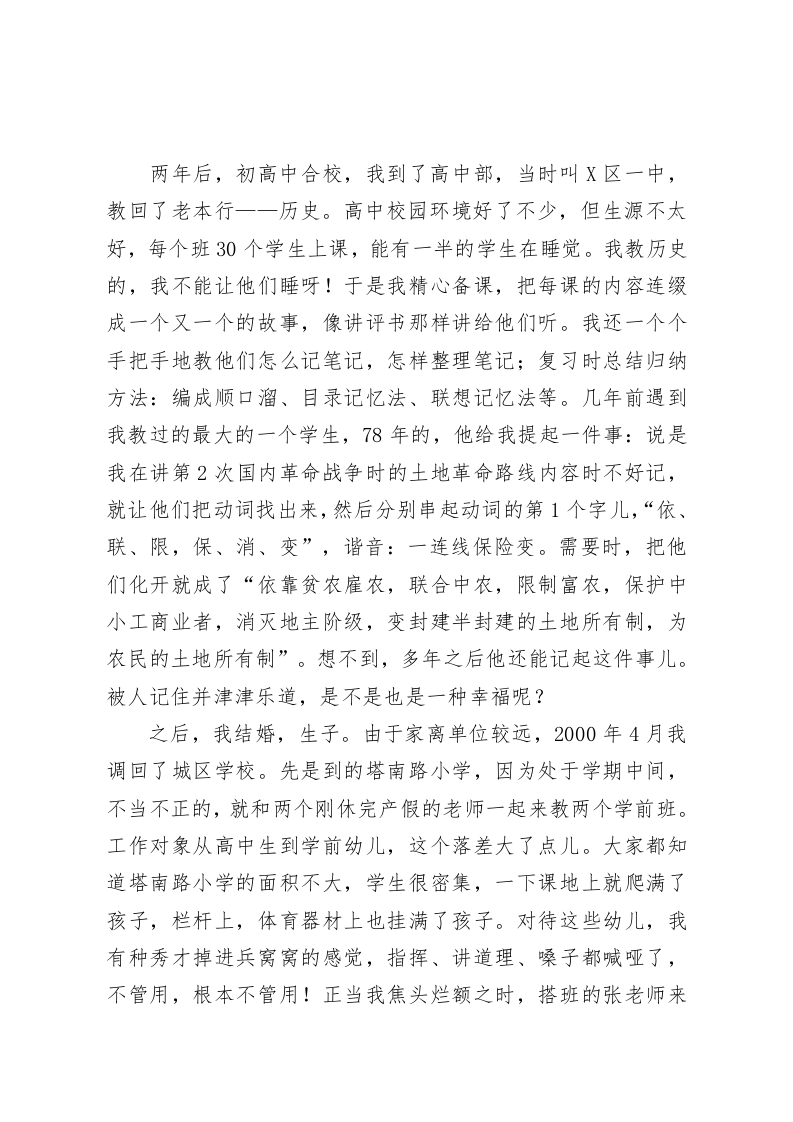 在入职教师培训会上的讲话:追寻教育的美好尊敬的领导、老师、亲爱的新同事们:大家,上午好!未觉三夏尽,时序已然秋。感谢领导的信任,让我这个老教师,能在这样一个绿意葱茏、瓜果飘香的夏秋之季、在今天这个新入职教师的开班仪式会上交流我从教多年的感受。看到眼前这些年轻的、充满朝气的、意气风发的脸庞,我不由的感慨:年轻真好!可是,我也年轻过呀!30年前,刚刚大学毕业的我被分配到了咱们X区的一所农村中学,当时叫X中学任教。那时的学校完全不是现在的美丽乡村面貌,就是一个空旷的院子,没有大门,院子中有一座2层楼,作为教室;拐角处有几间平房,是老师的办公室,下雨天常常漏雨;校园里没有几棵树,连草都很少,因为这里严重缺水,有时我们会从家里带够一天的饮用水来上班。就是在这个“无雨三尺土,有雨两脚泥”的简陋的工作环境中,我们一群年轻人却感到很快乐。我是历史专业的,学校工作的需要我教了英语。初为人师的热情和激情,我浑身似乎有使不完的劲儿,备课、教研、上课、改作业、辅导、处理学生问题,常常在校园里“迎来日出、送走晚霞”。孩子们淳朴善良,下午放学时会顺路捎走个学生,然后送他到家里,和家长们聊上几句,还会吃上孩子们递上来的鲜枣、柿子等。