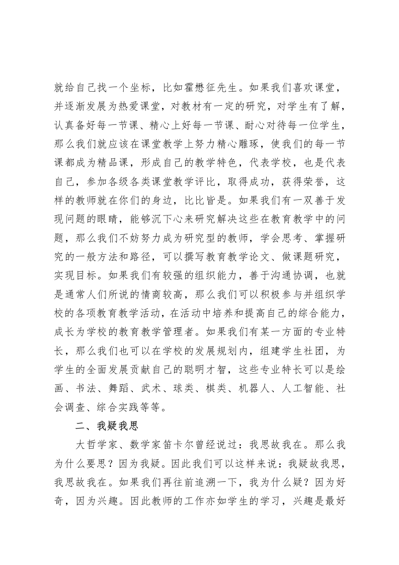 在师承教师研究院2025年答谢会上的讲话:以梦为马不负初心尊敬的各位专家、各位新老师、各位师承研究院的老师:大家下午好!今天答谢会的主角是各位成功上岸,入职教师岗位的各位新同行。祝贺各位成功上岸,欢迎各位成为教师。借此机会送给各位新老师三句话。一、认识自己古希腊大哲学家苏格拉底曾说:认识你自己。一个人对自己最了解的可能是自己,对自己最不了解的也可能是自己。最了解自己的可能是“物质”层面的显性的,而对于自己“精神”层面的隐性的特点可能也是最不了解的,所以我们经常会听到这样的话:一个人成长或成功的最大困难就是战胜自己。而要战胜自己的前提,当然是要了解自己。作为一名新入职的教师,我们首先必须给自己的教育生涯制定一个规划,树立一个目标,也就是说我们要成长一个什么样的教师,为了实现这个目标,我们应该怎么做。目标能否实现的一个基本前提是这个规划是否适合自己,适合自己的生涯规划应该基于自己的现实,也就是说要根据自己的特点进行规划。如果我们由喜欢学生,并逐渐发展为热爱学生,这种对学生的爱是发自内心的,能为学生的点滴进步而感到由衷欣慰,为学生的原地踏步而感到忧虑不安,那么我们