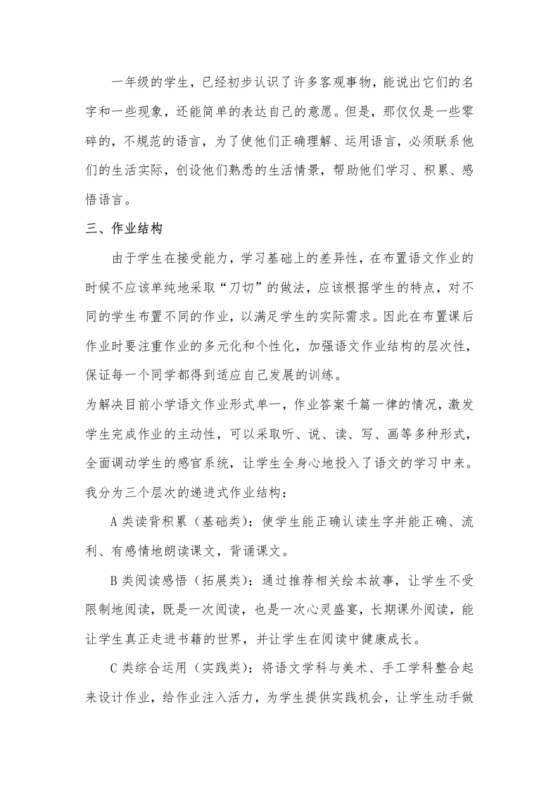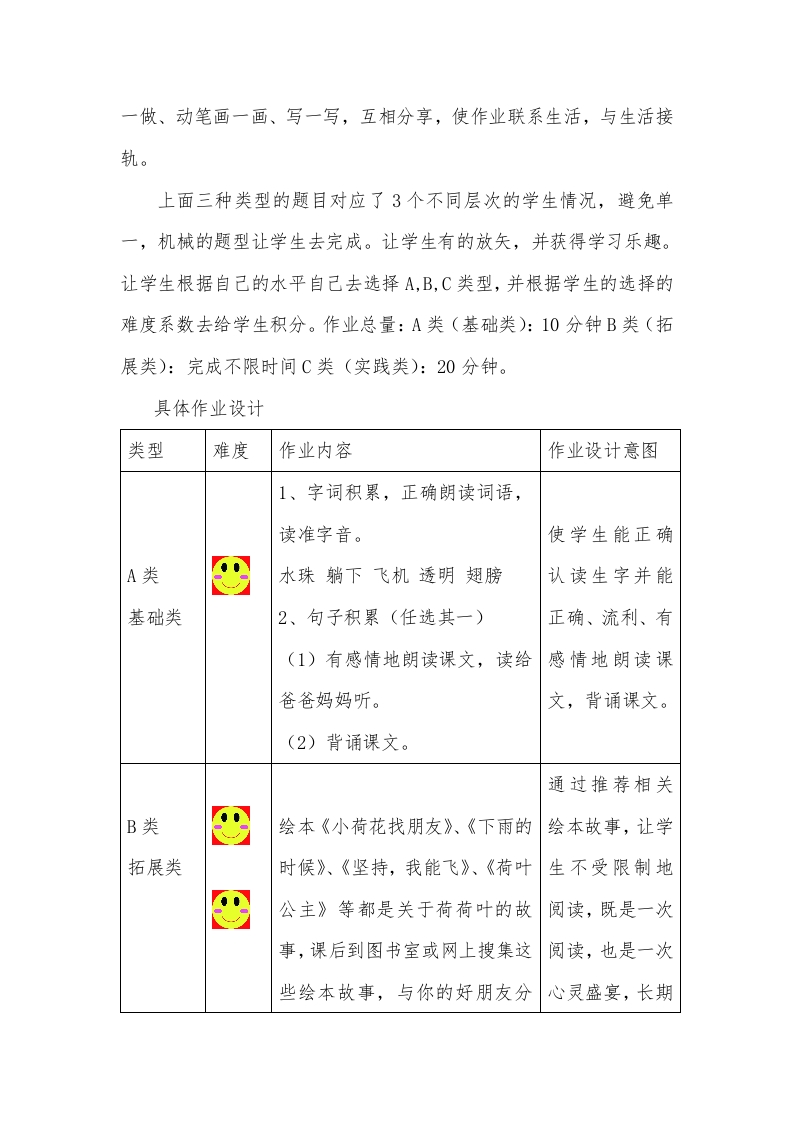 《荷叶圆圆》作业设计一、教材分析《荷叶圆圆》是一篇优美的散文诗,语言优美,想象丰富。文中圆圆的、绿绿的荷叶成了小水珠的摇篮,小蜻蜓的停机坪,小蜻蛙的歌台,小鱼儿的凉伞。全文字里行间都洋溢着童真童趣,让读者感受到夏天的美好。本文在表达上也很有特点。第1自然段中“荷叶圆圆的、绿绿的。”一句既符合孩子的语言习惯,又能让学生感受到句式表达的多样性。课文第2-5自然段结构相似,句式相同,都是先通过小水珠、小蜻蜓、小青蛙和小鱼儿的话语“荷叶是我的()”这样的比喻句,让我们了解荷叶的样子和作用,然后再写小动物们在荷叶下作什么,让我们看到荷叶下生动的画面,语言表达也负有节奏感。本课的插图色彩明快,情节性强,与课文的内容相映成趣。有些画面还能帮助学生理解一些平时不易观察到的现象,如,蜻蜓如何“立”在荷叶上的,小水珠如何愜意得“躺”在荷叶上等。二、学情分析这篇课文写了小水珠、小蜻蜓、小青蛙和小鱼儿等小伙伴喜欢荷叶的故事,符合孩子的年龄特点和认知规律,能够引起孩子的共鸣。在老师运用各种方法的指导下,通过学生反复朗读这篇课文,一定会受到情感的感染,再加上老师的语言渲染,学生的大胆想象,在有声有色的朗读中,学生一定能感受到夏天、大自然的美好。