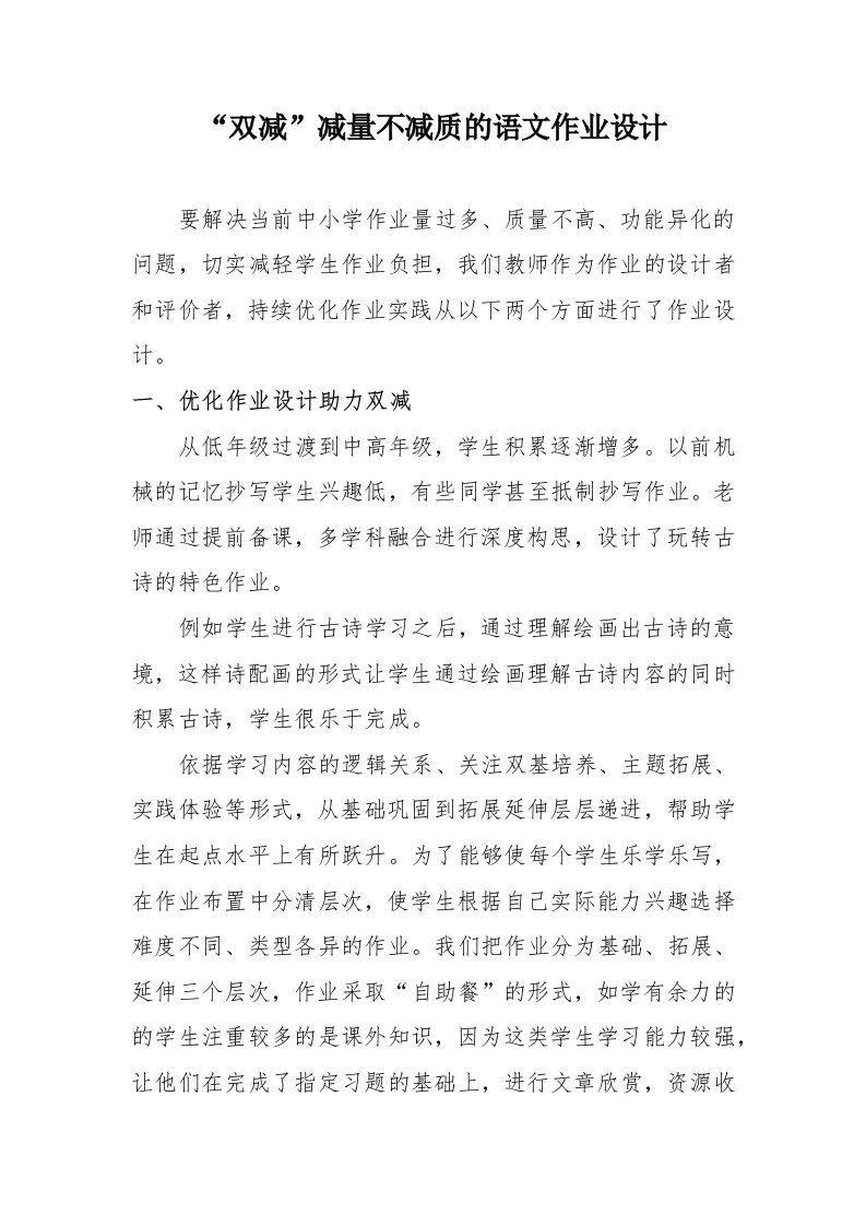 “双减”减量不减质的语文作业设计要解决当前中小学作业量过多、质量不高、功能异化的问题,切实减轻学生作业负担,我们教师作为作业的设计者和评价者,持续优化作业实践从以下两个方面进行了作业设计。一、优化作业设计助力双减从低年级过渡到中高年级,学生积累逐渐增多。以前机械的记忆抄写学生兴趣低,有些同学甚至抵制抄写作业。老师通过提前备课,多学科融合进行深度构思,设计了玩转古诗的特色作业。例如学生进行古诗学习之后,通过理解绘画出古诗的意境,这样诗配画的形式让学生通过绘画理解古诗内容的同时积累古诗,学生很乐于完成。依据学习内容的逻辑关系、关注双基培养、主题拓展、实践体验等形式,从基础巩固到拓展延伸层层递进,帮助学生在起点水平上有所跃升。为了能够使每个学生乐学乐写,在作业布置中分清层次,使学生根据自己实际能力兴趣选择难度不同、类型各异的作业。我们把作业分为基础、拓展、延伸三个层次,作业采取“自助餐”的形式,如学有余力的的学生注重较多的是课外知识,因为这类学生学习能力较强,让他们在完成了指定习题的基础上,进行文章欣赏,资源收