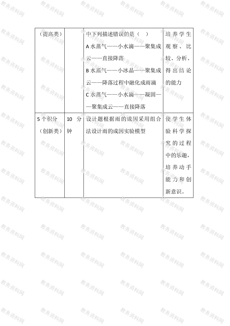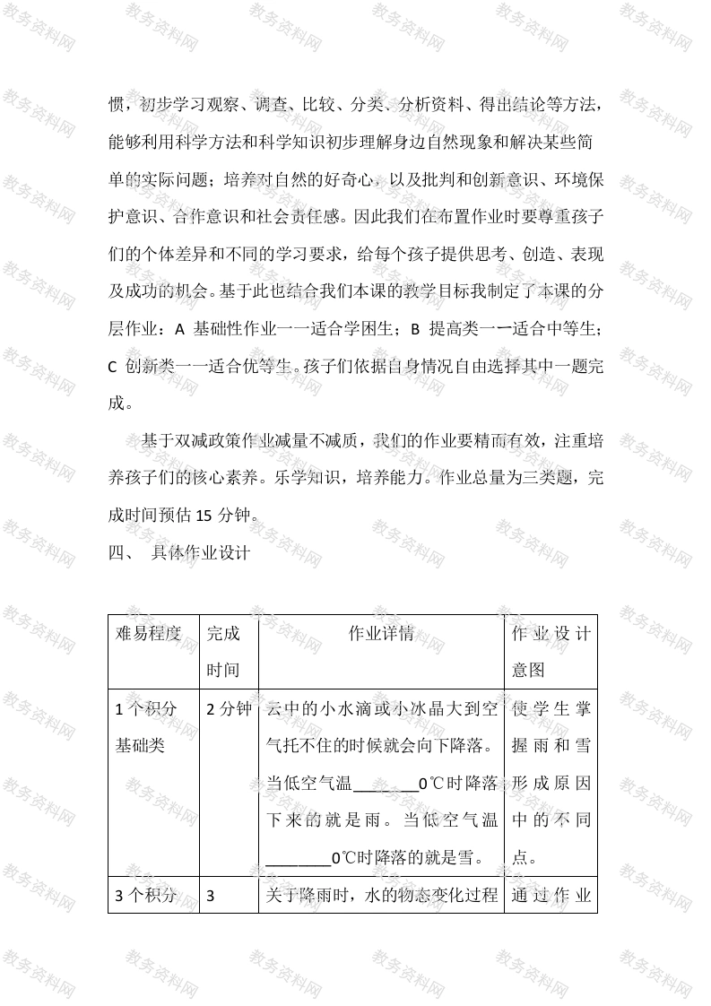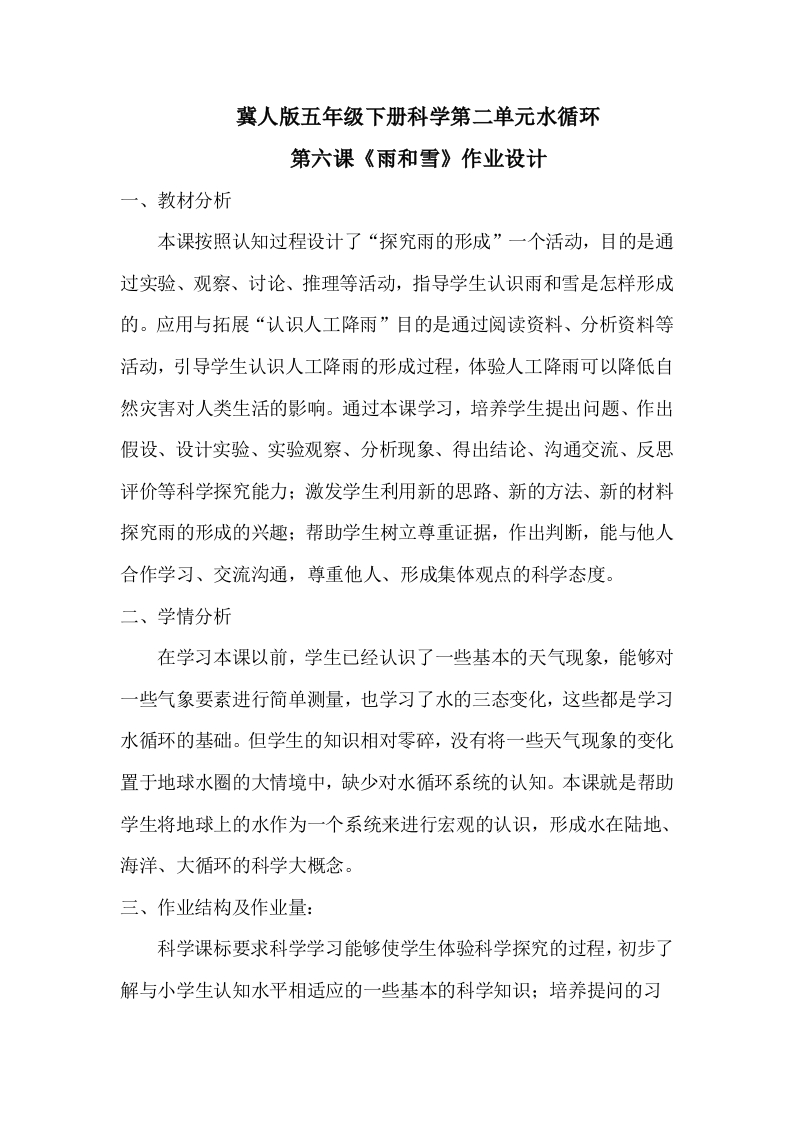 冀人版五年级下册科学第二单元水循环第六课《雨和雪》作业设计一、教材分析本课按照认知过程设计了“探究雨的形成”一个活动,目的是通过实验、观察、讨论、推理等活动,指导学生认识雨和雪是怎样形成的。应用与拓展“认识人工降雨”目的是通过阅读资料、分析资料等活动,引导学生认识人工降雨的形成过程,体验人工降雨可以降低自然灾害对人类生活的影响。通过本课学习,培养学生提出问题、作出假设、设计实验、实验观察、分析现象、得出结论、沟通交流、反思评价等科学探究能力:激发学生利用新的思路、新的方法、新的材料探究雨的形成的兴趣;帮助学生树立尊重证据,作出判断,能与他人合作学习、交流沟通,尊重他人、形成集体观点的科学态度。二、学情分析在学习本课以前,学生己经认识了一些基本的天气现象,能够对一些气象要素进行简单测量,也学习了水的三态变化,这些都是学习水循环的基础。但学生的知识相对零碎,没有将一些天气现象的变化置于地球水圈的大情境中,缺少对水循环系统的认知。本课就是帮助学生将地球上的水作为一个系统来进行宏观的认识,形成水在陆地、海洋、大循环的科学大概念。三、作业结构及作业量:科学课标要求科学学习能够使学生体验科学探究的过程,初步了解与小学生认知水平相适应的一些基本的科学知识:培养提问的习