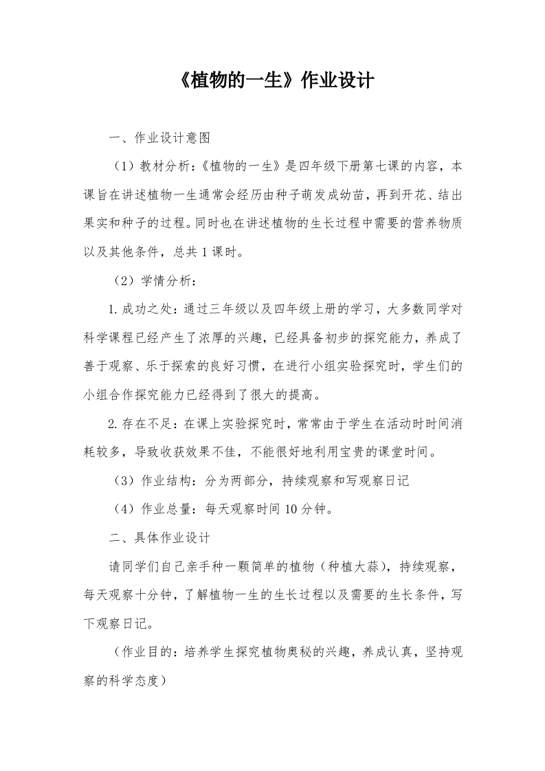 《植物的一生》作业设计一、作业设计意图(1)教材分析:《植物的一生》是四年级下册第七课的内容,本课旨在讲述植物一生通常会经历由种子萌发成幼苗,再到开花、结出果实和种子的过程。同时也在讲述植物的生长过程中需要的营养物质以及其他条件,总共1课时。(2)学情分析:1.成功之处:通过三年级以及四年级上册的学习,大多数同学对科学课程已经产生了浓厚的兴趣,已经具备初步的探究能力,养成了善于观察、乐于探索的良好习惯,在进行小组实验探究时,学生们的小组合作探究能力已经得到了很大的提高。2.存在不足:在课上实验探究时,常常由于学生在活动时时间消耗较多,导致收获效果不佳,不能很好地利用宝贵的课堂时间。(3)作业结构:分为两部分,持续观察和写观察日记(4)作业总量:每天观察时间10分钟。二、具体作业设计请同学们自己亲手种一颗简单的植物(种植大蒜),持续观察,每天观察十分钟,了解植物一生的生长过程以及需要的生长条件,写下观察日记。(作业目的:培养学生探究植物奥秘的兴趣,养成认真,坚持观察的科学态度)