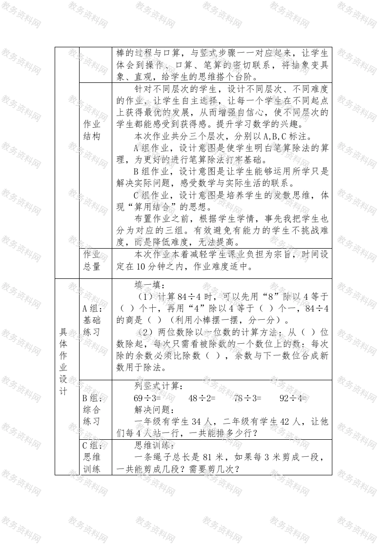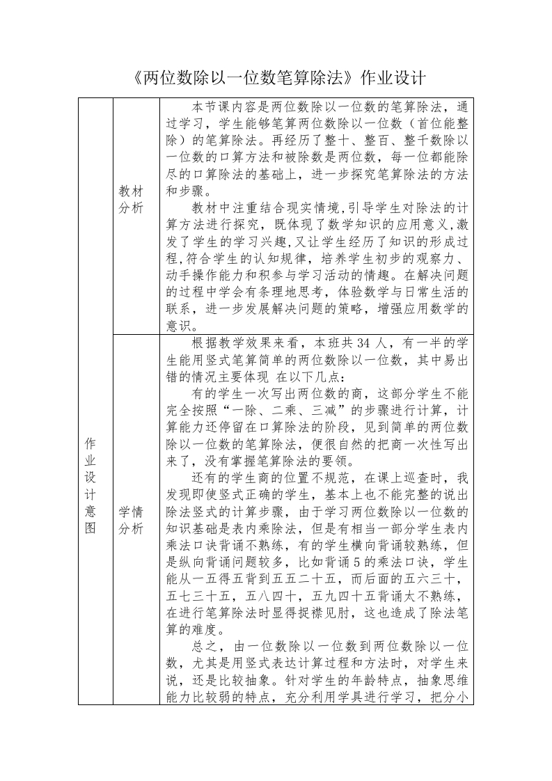 《两位数除以一位数笔算除法》作业设计本节课内容是两位数除以一位数的笔算除法,通过学习,学生能够笔算两位数除以一位数(首位能整除)的笔算除法。再经历了整十、整百、整千数除以一位数的口算方法和被除数是两位数,每一位都能除尽的口算除法的基础上,进一步探究笔算除法的方法教材和步骤。分析教材中注重结合现实情境,引导学生对除法的计算方法进行探究,既体现了数学知识的应用意义,激发了学生的学习兴趣,又让学生经历了知识的形成过程,符合学生的认知规律,培养学生初步的观察力、动手操作能力和积参与学习活动的情趣。在解决问题的过程中学会有条理地思考,体验数学与日常生活的联系,进一步发展解决问题的策略,增强应用数学的意识。根据教学效果来看,本班共34人,有一半的学生能用竖式笔算简单的两位数除以一位数,其中易出错的情况主要体现在以下几点:有的学生一次写出两位数的商,这部分学生不能完全按照“一除、二乘、三减”的步骤进行计算,计算能力还停留在口算除法的阶段,见到简单的两位数作除以一位数的笔算除法,便很自然的把商一次性写出来了,没有掌握笔算除法的要领。设还有的学生商的位置不规范,在课上巡查时,我发现即使竖式正确的学生,基本上也不能完整的说出意图学情除法竖式的计算步骤,由于学习两位数除以一位数的分析知识基础是表内乘除法,但是有相当一部分学生表内乘法口诀背诵不熟练,有的学生横向背诵较熟练,但是纵向背诵问题较多,比如背诵5的乘法口诀,学生能从一五得五背到五五二十五,而后面的五六三十,五七三十五,五八四十,五九四十五背诵太不熟练,在进行笔算除法时显得捉襟见肘,这也造成了除法笔算的难度。总之,由一位数除以一位数到两位数除以一位数,尤其是用竖式表达计算过程和方法时,对学生来说,还是比较抽象。针对学生的年龄特点,抽象思维能力比较弱的特点,充分利用学具进行学习,把分小