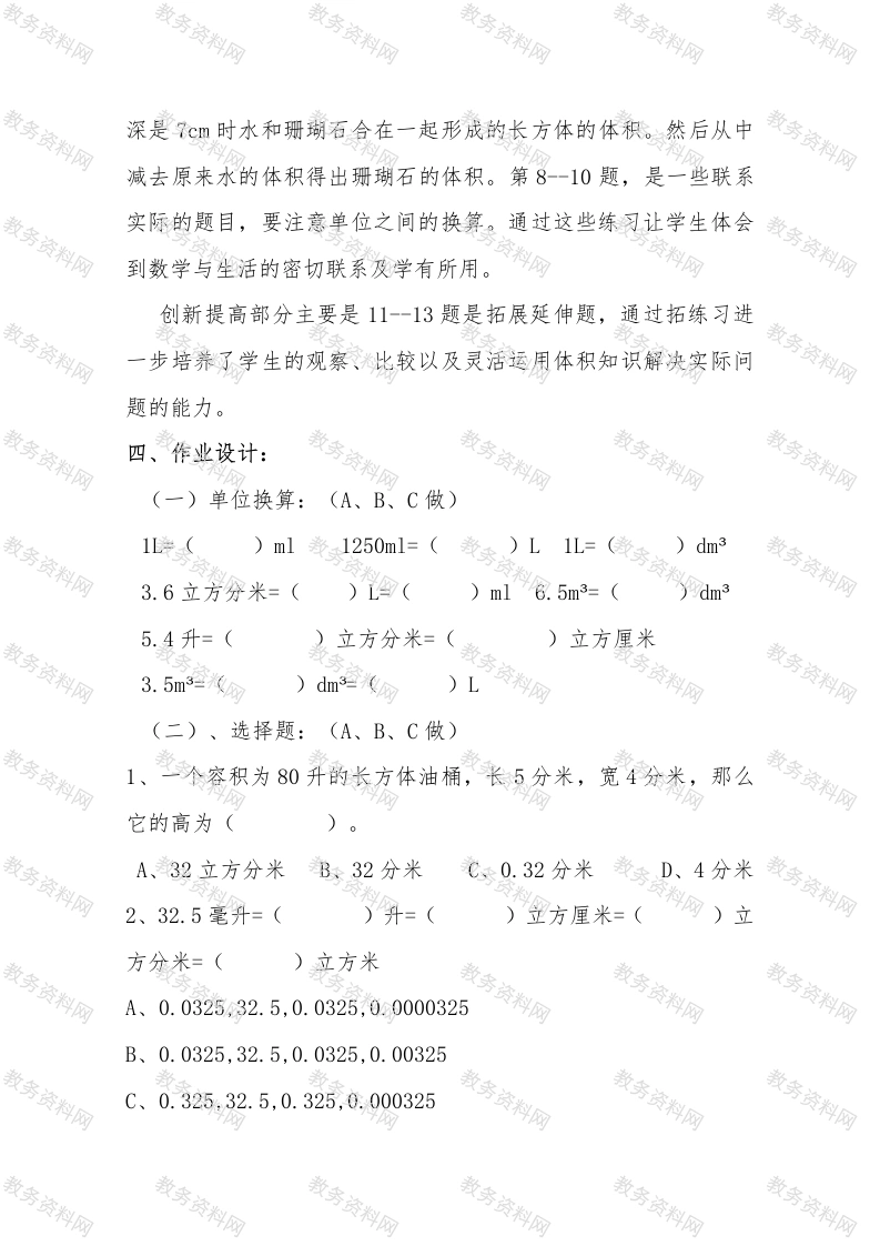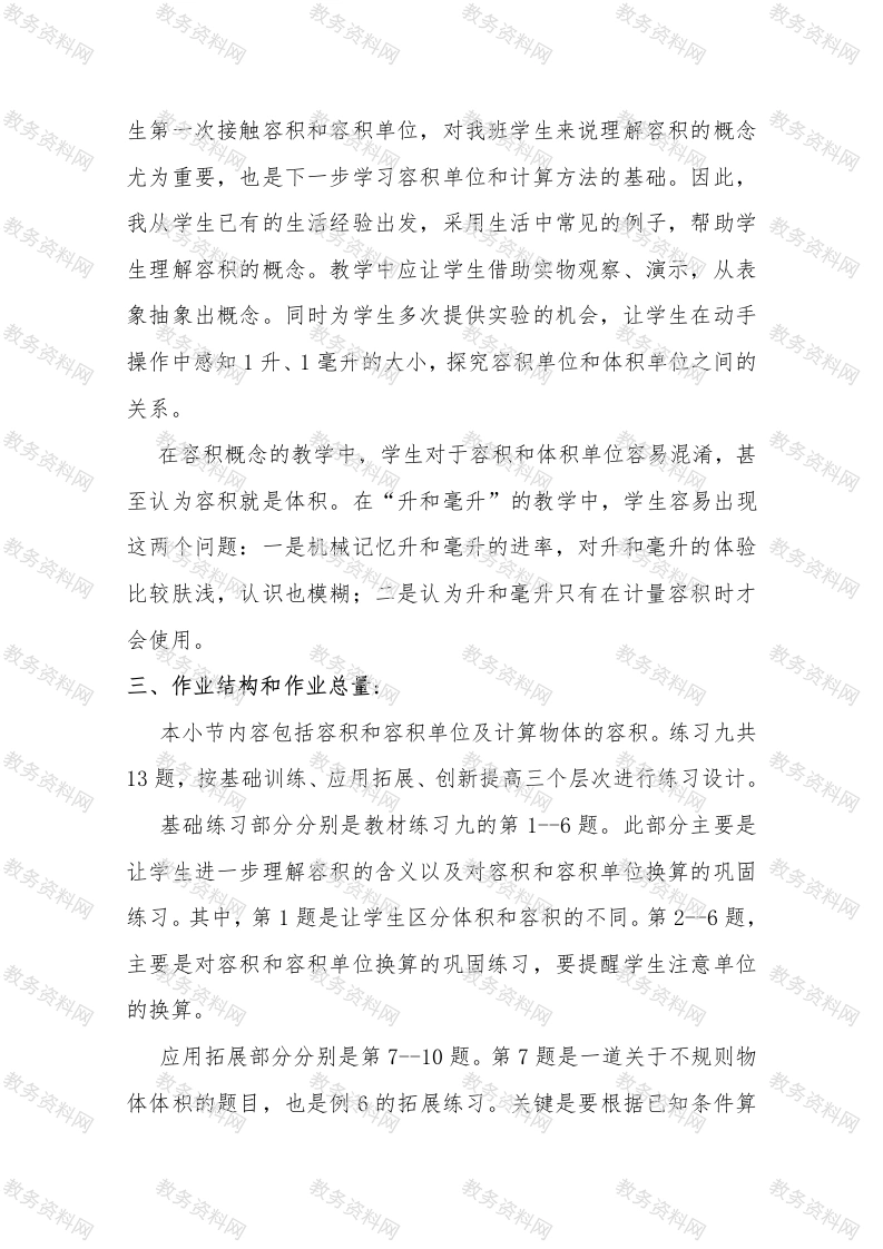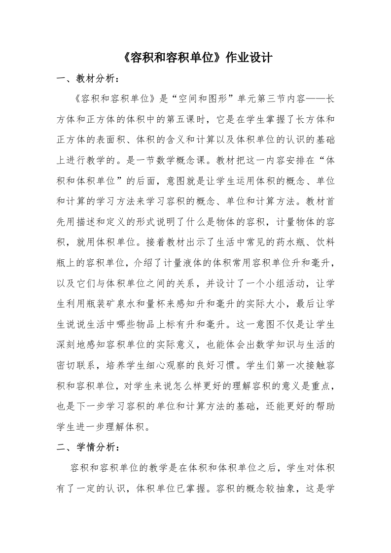 《容积和容积单位》作业设计一、教材分析:《容积和容积单位》是“空间和图形”单元第三节内容一一长方体和正方体的体积中的第五课时,它是在学生掌握了长方体和正方体的表面积、体积的含义和计算以及体积单位的认识的基础上进行教学的。是一节数学概念课。教材把这一内容安排在“体积和体积单位”的后面,意图就是让学生运用体积的概念、单位和计算的学习方法来学习容积的概念、单位和计算方法。教材首先用描述和定义的形式说明了什么是物体的容积,计量物体的容积,就用体积单位。接着教材出示了生活中常见的药水瓶、饮料瓶上的容积单位,介绍了计量液体的体积常用容积单位升和毫升,以及它们与体积单位之间的关系,并设计了一个小组活动,让学生利用瓶装矿泉水和量杯来感知升和毫升的实际大小,最后让学生说说生活中哪些物品上标有升和毫升。这一意图不仅是让学生深刻地感知容积单位的实际意义,也能体会出数学知识与生活的密切联系,培养学生细心观察的良好习惯。学生们第一次接触容积和容积单位,对学生来说怎么样更好的理解容积的意义是重点,也是下一步学习容积的单位和计算方法的基础,还能更好的帮助学生进一步理解体积。二、学情分析:容积和容积单位的教学是在体积和体积单位之后,学生对体积有了一定的认识,体积单位已掌握。容积的概念较抽象,这是学