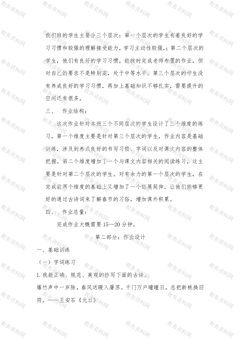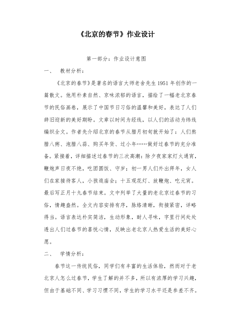 《北京的春节》作业设计第一部分:作业设计意图一、教材分析:《北京的春节》是著名的语言大师老舍先生1951年创作的一篇散文。他用朴素自然、京味浓郁的语言,描绘了一幅老北京春节的民俗画卷,展示了中国节日习俗的温馨和美好,表达了人们辞旧迎新的美好期盼。文章以时间为经线,以人们的活动为纬线编织全文。作者先介绍北京的春节从腊月初旬就开始了:人们熬腊八粥、泡腊八蒜、购买年货、过小年…做好过春节的充分准备。紧接着,详细描述过春节的三次高潮:除夕夜家家灯火通宵,鞭炮声日夜不绝,吃团圆饭、守岁;初一男人们外出拜年,女人们在家接待客人,小孩逛庙会;十五观花灯、放鞭炮、吃元宵。最后写正月十九春节结束。文中列举了大量的老北京过春节的习俗,情趣盎然。全文内容安排有序,脉络清晰,衔接紧密,详略得当。语言表达朴实简洁,生动形象,耐人寻味,字里行间处处透出人们过春节的喜悦心情,反映出老北京人热爱生活的美好心愿。二、学情分析:春节这一传统民俗,同学们有丰富的生活体验,然而对于老北京人怎么过春节,学生了解的并不多,所以有浓厚的学习兴趣,但由于基础不同、学习习惯不同,学生的学习水平还是参差不齐。