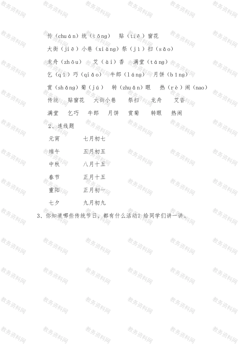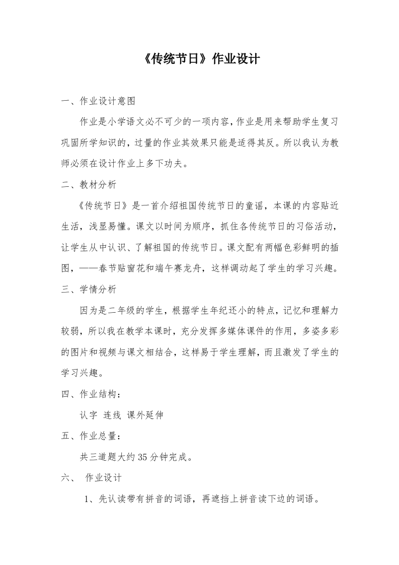 《传统节日》作业设计一、作业设计意图作业是小学语文必不可少的一项内容,作业是用来帮助学生复习巩固所学知识的,过量的作业其效果只能是适得其反。所以我认为教师必须在设计作业上多下功夫。二、教材分析《传统节日》是一首介绍祖国传统节日的童谣,本课的内容贴近生活,浅显易懂。课文以时间为顺序,抓住各传统节日的习俗活动,让学生从中认识、了解祖国的传统节日。课文配有两幅色彩鲜明的插图,一一春节贴窗花和端午赛龙舟,这样调动起了学生的学习兴趣。三、学情分析因为是二年级的学生,根据学生年纪还小的特点,记忆和理解力较弱,所以我在教学本课时,充分发挥多媒体课件的作用,多姿多彩的图片和视频与课文相结合,这样易于学生理解,而且激发了学生的学习兴趣。四、作业结构:认字连线课外延伸五、作业总量:共三道题大约35分钟完成。六、作业设计1、先认读带有拼音的词语,再遮挡上拼音读下边的词语。