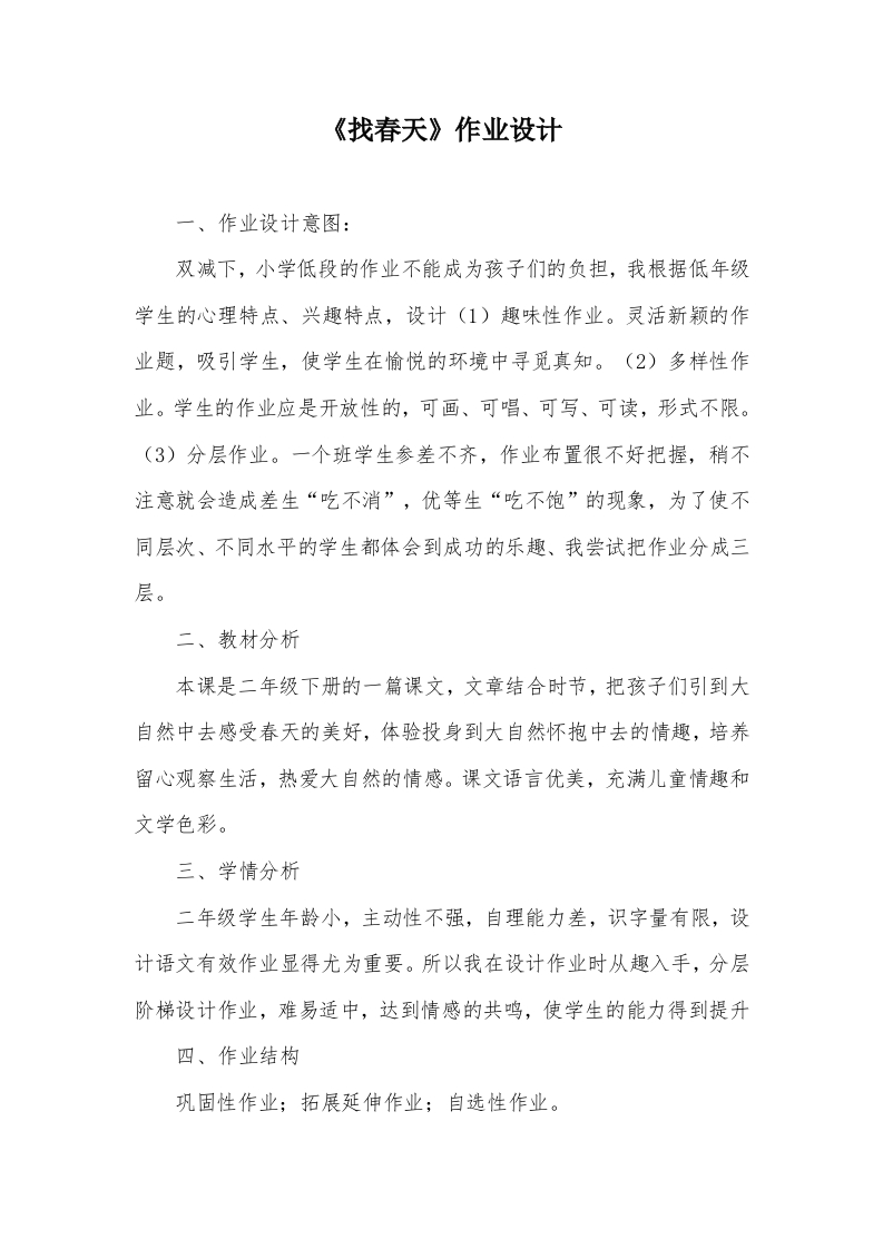 《找春天》作业设计一、作业设计意图:双减下,小学低段的作业不能成为孩子们的负担,我根据低年级学生的心理特点、兴趣特点,设计(1)趣味性作业。灵活新颖的作业题,吸引学生,使学生在愉悦的环境中寻觅真知。(2)多样性作业。学生的作业应是开放性的,可画、可唱、可写、可读,形式不限。(3)分层作业。一个班学生参差不齐,作业布置很不好把握,稍不注意就会造成差生“吃不消”,优等生“吃不饱”的现象,为了使不同层次、不同水平的学生都体会到成功的乐趣、我尝试把作业分成三层。二、教材分析本课是二年级下册的一篇课文,文章结合时节,把孩子们引到大自然中去感受春天的美好,体验投身到大自然怀抱中去的情趣,培养留心观察生活,热爱大自然的情感。课文语言优美,充满儿童情趣和文学色彩。三、学情分析二年级学生年龄小,主动性不强,自理能力差,识字量有限,设计语文有效作业显得尤为重要。所以我在设计作业时从趣入手,分层阶梯设计作业,难易适中,达到情感的共鸣,使学生的能力得到提升四、作业结构巩固性作业;拓展延伸作业;自选性作业。